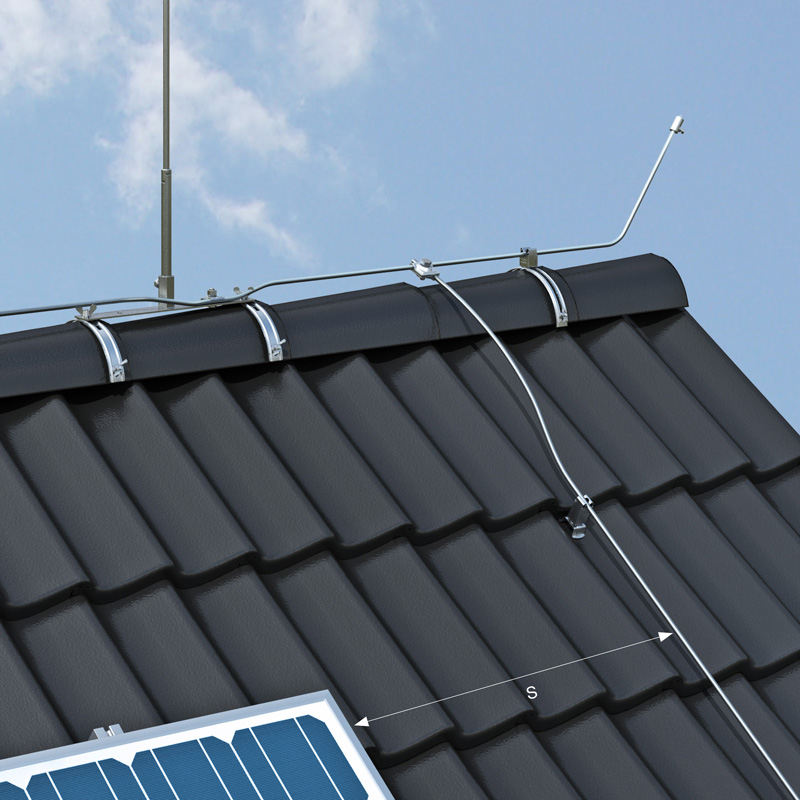 - Saules fotoelementu sistēma ar ārējo zibensaizsardzību un pietiekamu atdalošo attālumu