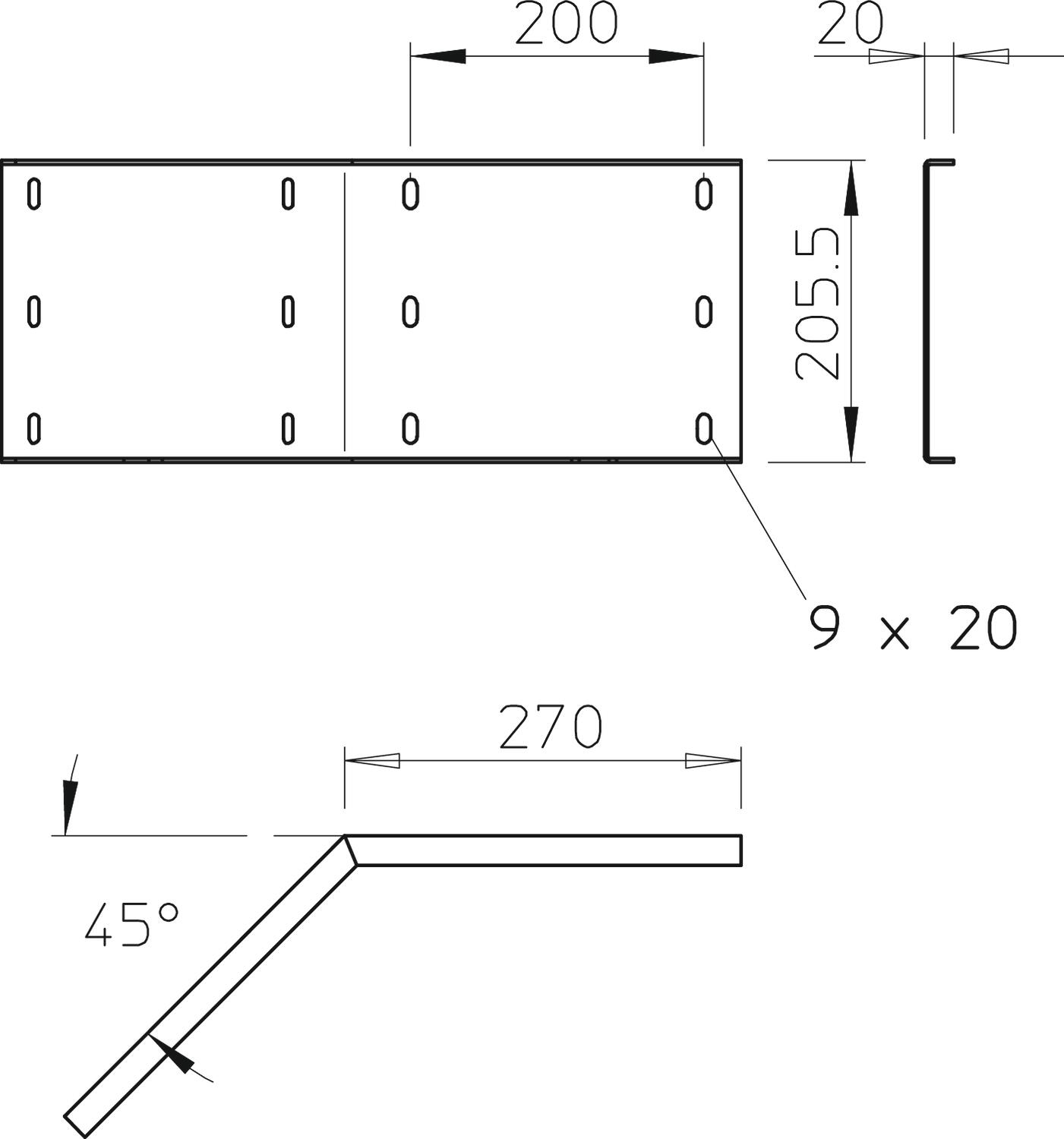 Produkta aprakstsHorizontāls 45° leņķa savienotājs gara laiduma kabeļu trepēm ar malas augstumu 200 mm.