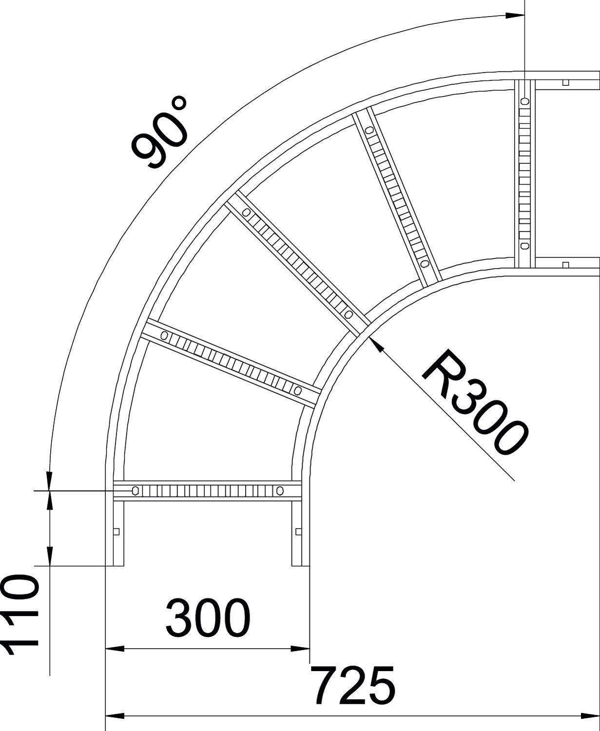 Produkta aprakstsHorizontāls 90° līkums ar piemetinātu spraisli visu veidu kabeļu trepēm, kuru malas augstums ir 110 mm.