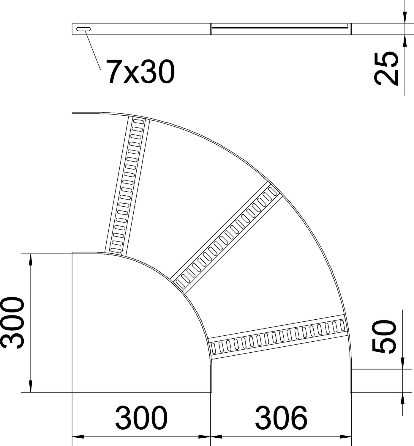Produkta apraksts90° līkums kuģu būvei paredzētām kabeļu trepēm, tips SL 42, ar malas augstums 25 mm, ar iemetinātiem, ar vaļējo pusi uz leju vērstiem un perforētiem trapeces formas spraišļiem.