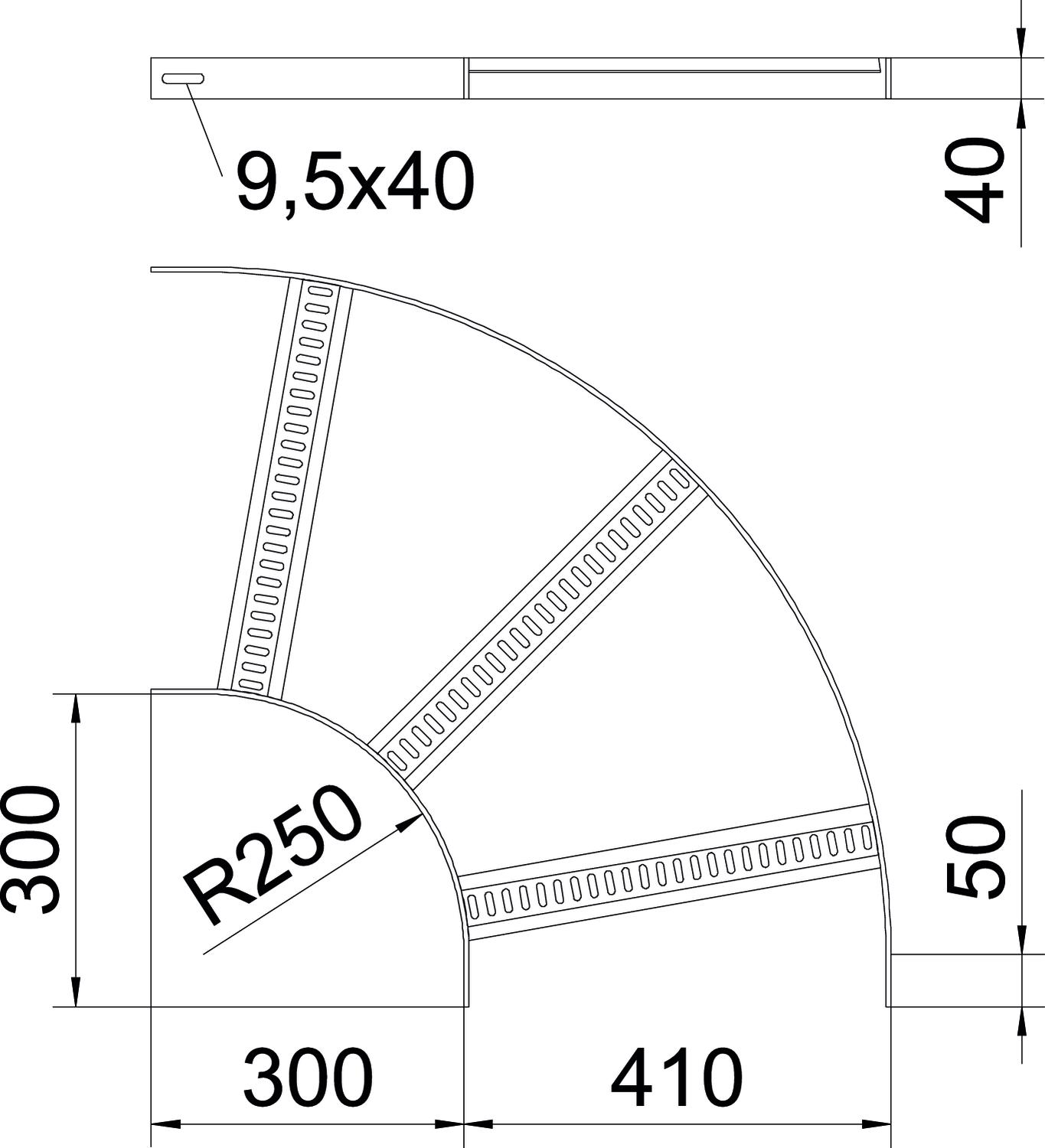 Produkta apraksts90° līkums kuģu būvei paredzētām kabeļu trepēm, tips SL 62, ar malas augstums 40 mm, ar iemetinātiem, ar vaļējo pusi uz leju vērstiem un perforētiem trapeces formas spraišļiem.