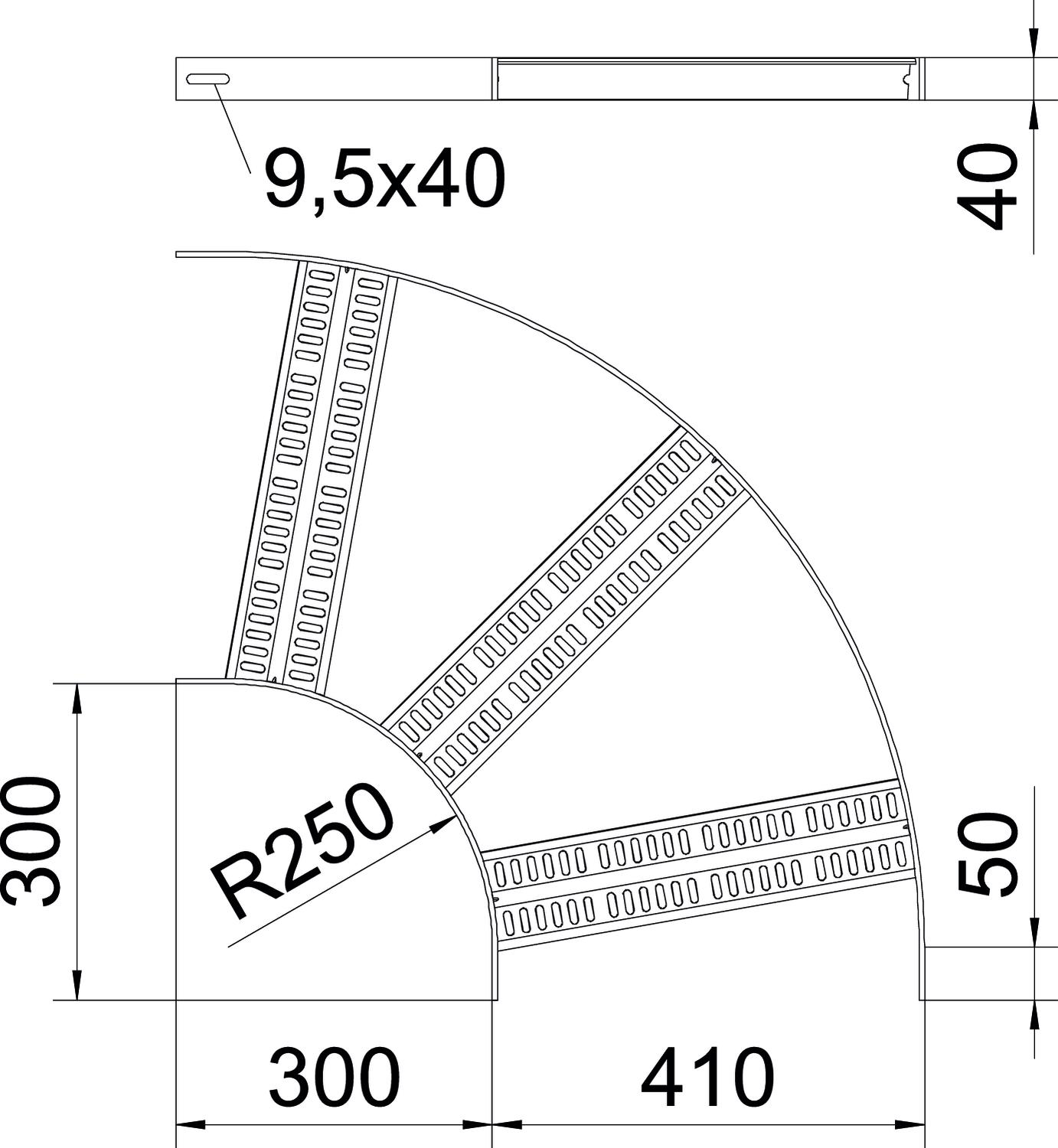 Produkta apraksts90° līkums kuģu būvei paredzētām kabeļu trepēm, tips SLZ, ar malas augstums 40 mm, ar iemetinātiem, perforētiem Z formas spraišļiem.