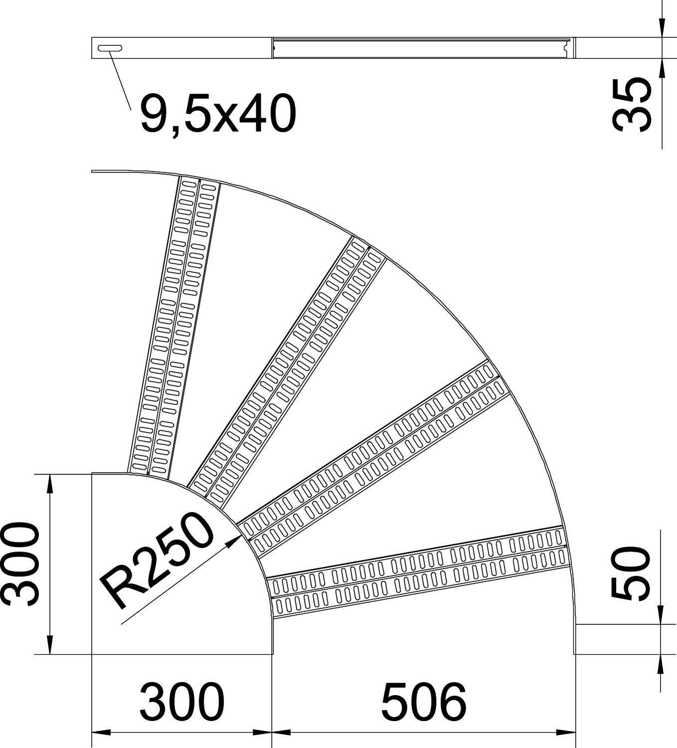 Produkta apraksts90° līkums kuģu būvei paredzētām kabeļu trepēm, tips SLZ L, ar malas augstums 35 mm, ar iemetinātiem, perforētiem Z formas spraišļiem.