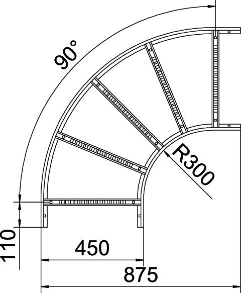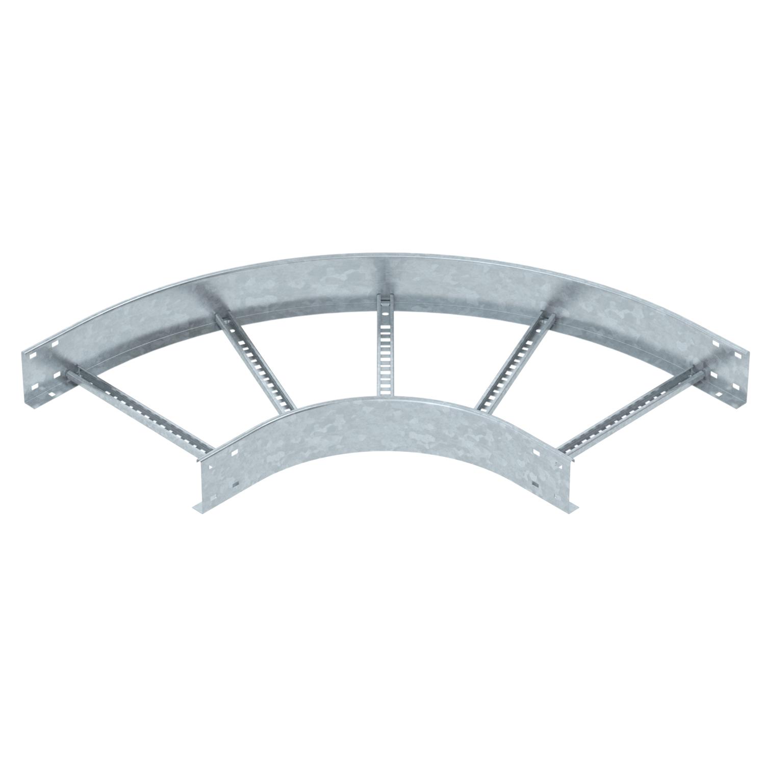 Produkta aprakstsHorizontāls 90° līkums ar piemetinātu spraisli visu veidu kabeļu trepēm, kuru malas augstums ir 110 mm.