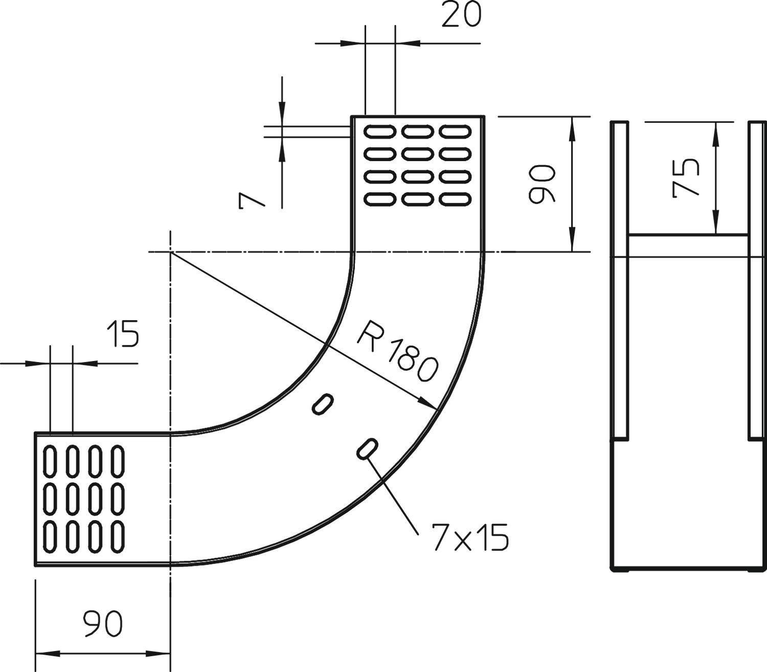 Produkta aprakstsUz augšu vērsts 90° vertikālais līkums visu veidu kabeļu renēm ar malas augstumu 85 mm.