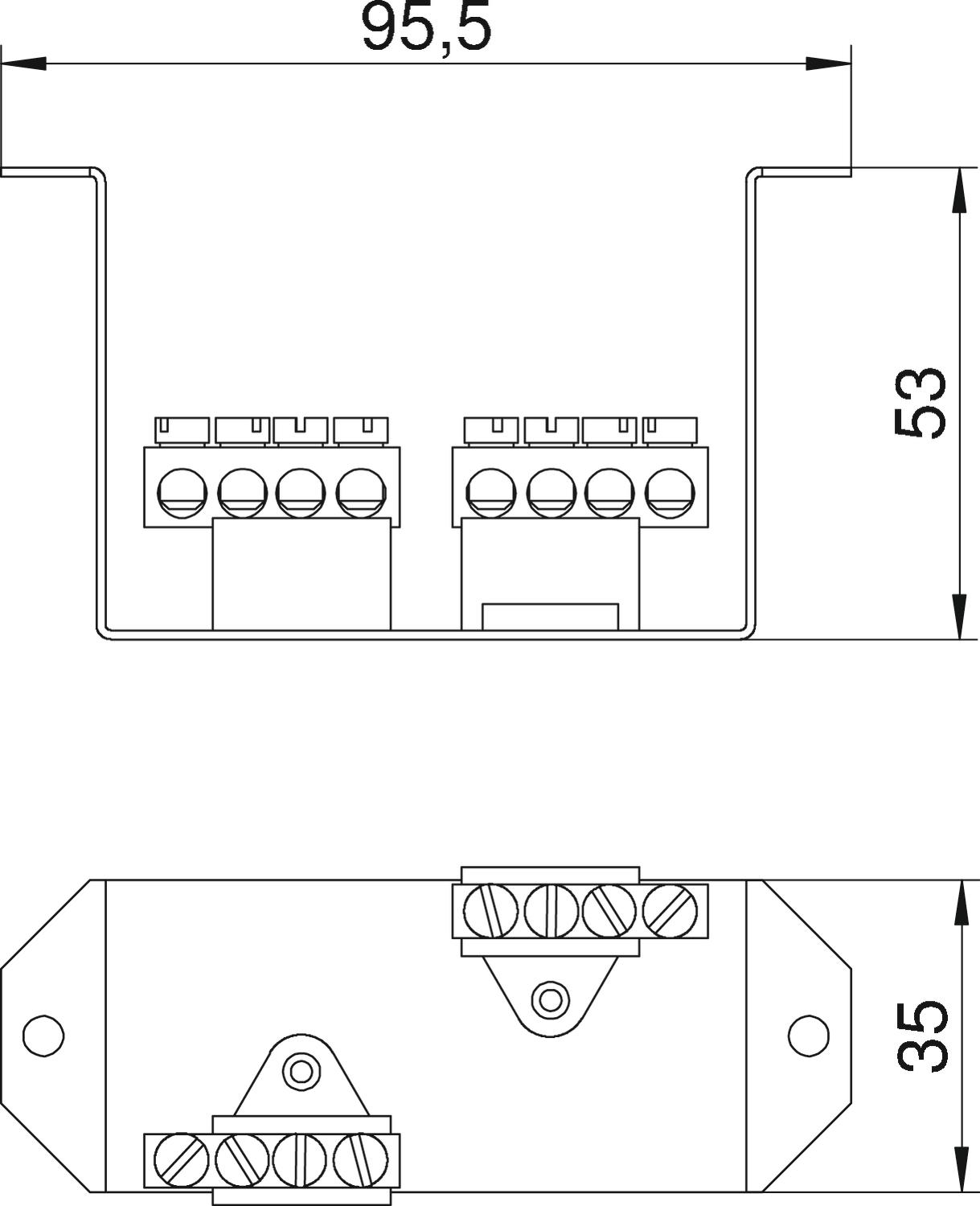 - pamatelementa ar montāžas sliedi 35 mm, N spaiļu kopnes 4 x 10 mm² un PE spaiļu kopnes 4 x 10 mm²