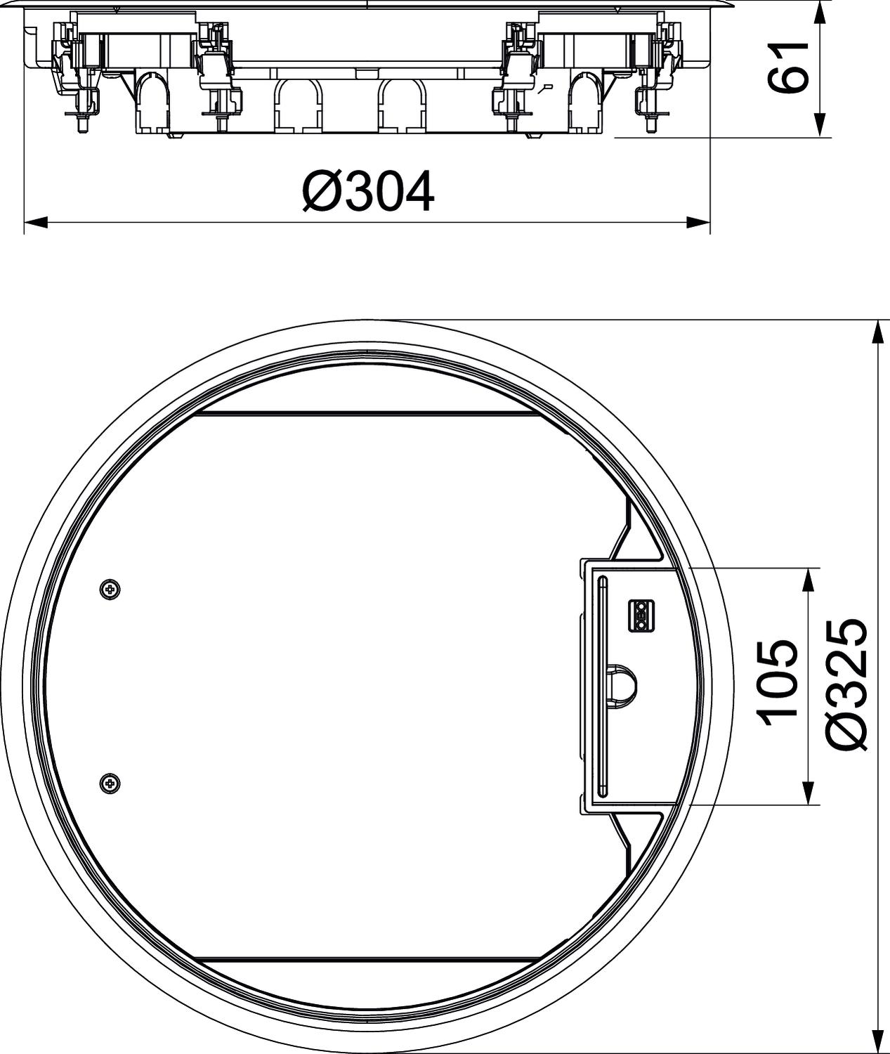 Ar izgriezumu grīdas segumam nē Ārējais diametrs 325 mm Atvēršanas mehānisms Roktura skava Augstums 61 mm CO2 pēdas nospiedums (GWP) no šūpuļa līdz vārtiem 7,7669 kg CO2e / 1 Gabals Garums 325 mm Grīdas augstums min. 58 mm Grīdas kopšana sauss Grīdas līmeņa augstums min. 55 mm Grīdas seguma aizsardzības rāmis jā Grīdas seguma biezums 5 mm Iebūvējamo ierīču skaits 8 Iebūvēšanas diametrs 304 Iebūvēšanas dziļums 58 mm Iekārtas stiprinājums ierīču kārbu nostiprināšanai nē Iespējams iemontēt blīvi nē Izmērs Ø325x61 Izpildījums apaļš Kabeļu izvada izpildījums Pagriežams kabeļa izvads Krāsa dzelzs pelēks; RAL 7011 Lielas slodzes versija nē Materiāls Poliamīds Nominālais lielums ierīču iebūvēšanas vienībai R9 Piemērots aizvērtam zemgrīdas kanālam vienā līmenī ar grīdas segumu jā Piemērots dubulto grīdu montāžai jā Piemērots iebūvēšanai dobās grīdās jā Piemērots mitrajai kopšanai nē Piemērots zemgrīdas kanālam jā Piemērots zemgrīdas kanālam, ko pārklāj grīdas segums jā Platums 325 mm Spriegošanas diapazons D maks. 28 mm Spriegošanas diapazons D min. 10 mm Vertikālā slodze, liels laukums līdz 5 000 N Vertikālā slodze, mazs laukums līdz 3 000 N - Visi tipi
