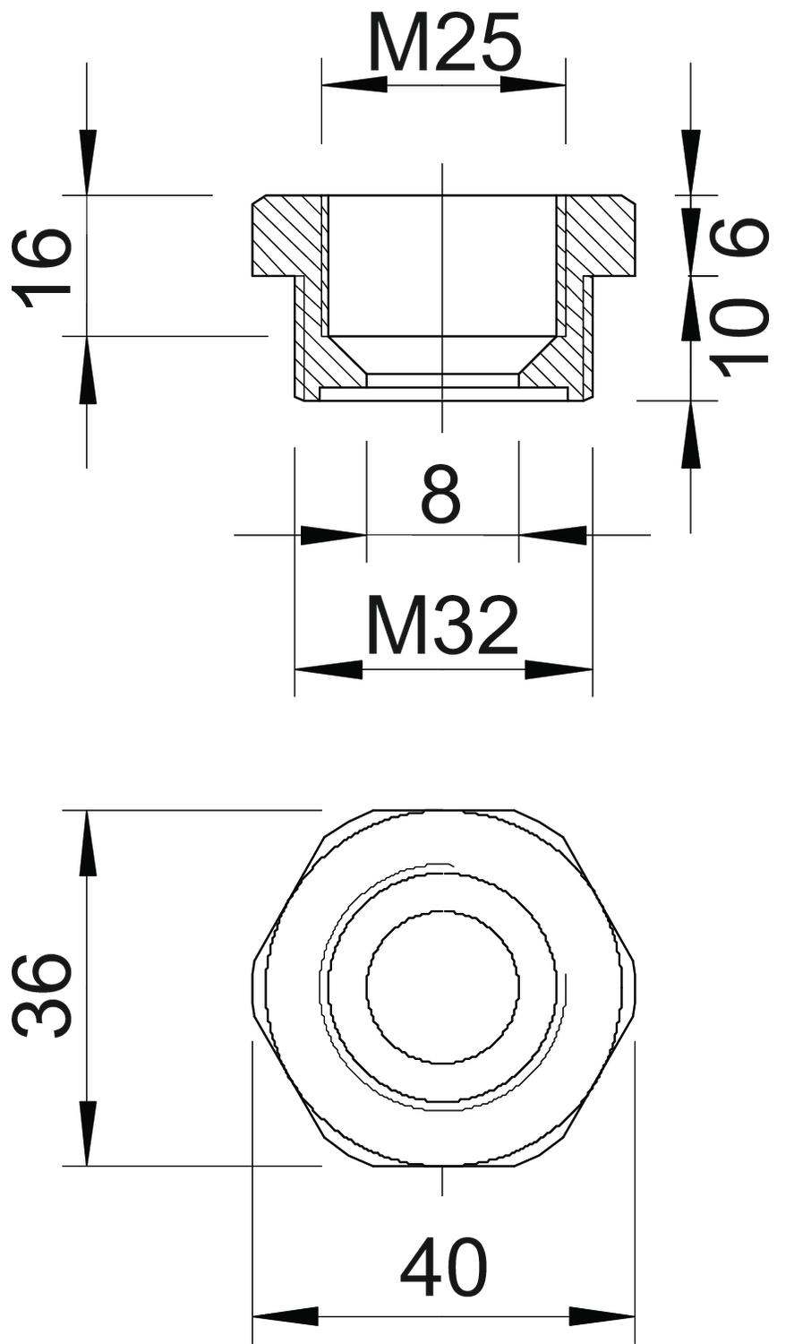 Produkta aprakstsSašaurinājums ar metrisko iekšējo un ārējo vītni plastmasas kabeļu skrūvsavienojumu montāžai uz korpusiem. Aizsardzības veids IP54 bez papildu savienojuma blīves. Aizsardzības veids līdz IP68 iespējams ar papildu blīvi, piemēram, apaļo blīvgredzenu vai plakano blīvgredzenu.