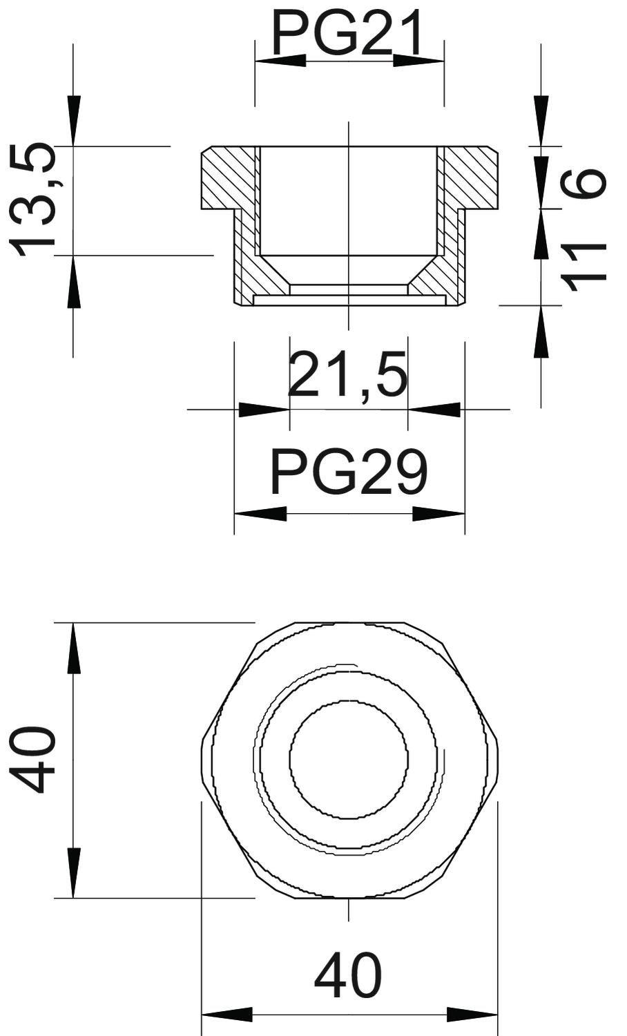 aizsargāta pret eksploziju nē Atslēgas platums 39 CO2 pēdas nospiedums (GWP) no šūpuļa līdz vārtiem 0,0515 kg CO2e / 1 Gabals Izmērs PG29-PG21 Izmērs D 21,5 mm Izmērs e 40 mm Izmērs L1 11 mm Izmērs L2 6 mm Izmērs L3 13,5 mm Krāsa gaiši pelēks; RAL 7035 Materiāls Poliamīds Nesatur halogēnus jā Niķelēts nē Vīnes veids – ārējā vītne Pg Vītnes garums 11 mm Vītnes izmērs PG, ārējais 29 Vītnes izmērs PG, iekšējais 21 Vītnes veids – iekšējā vītne Pg - Visi tipi