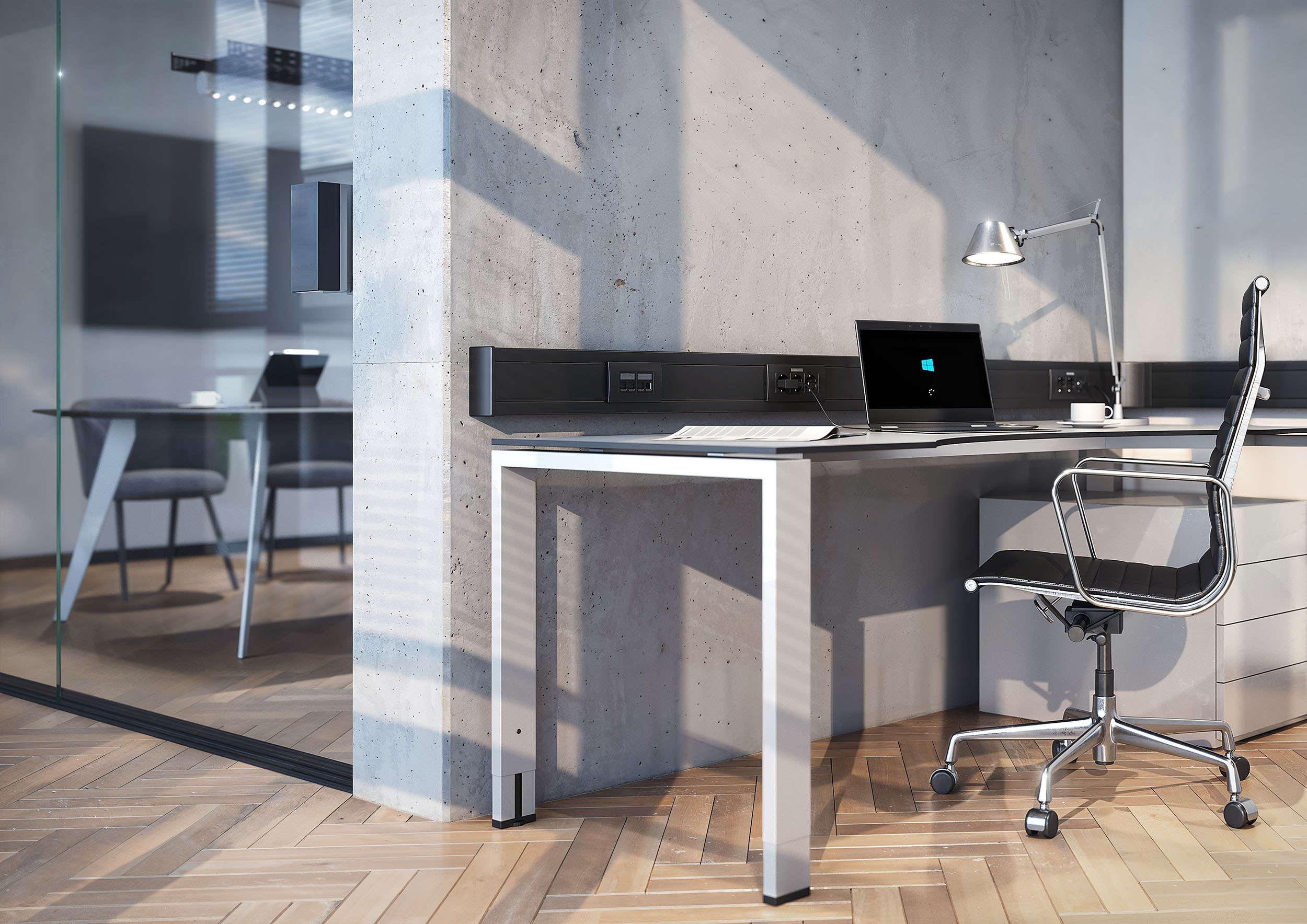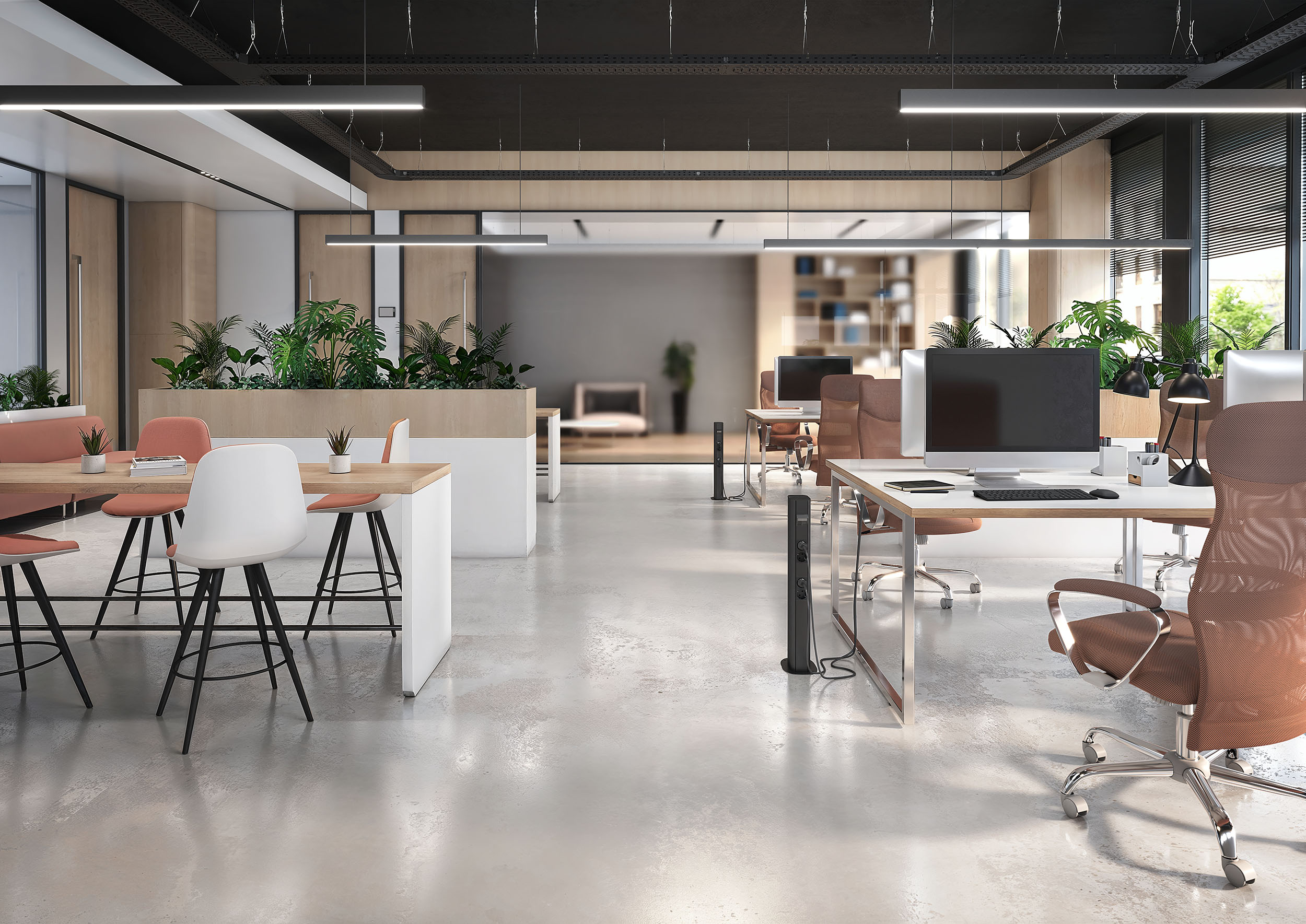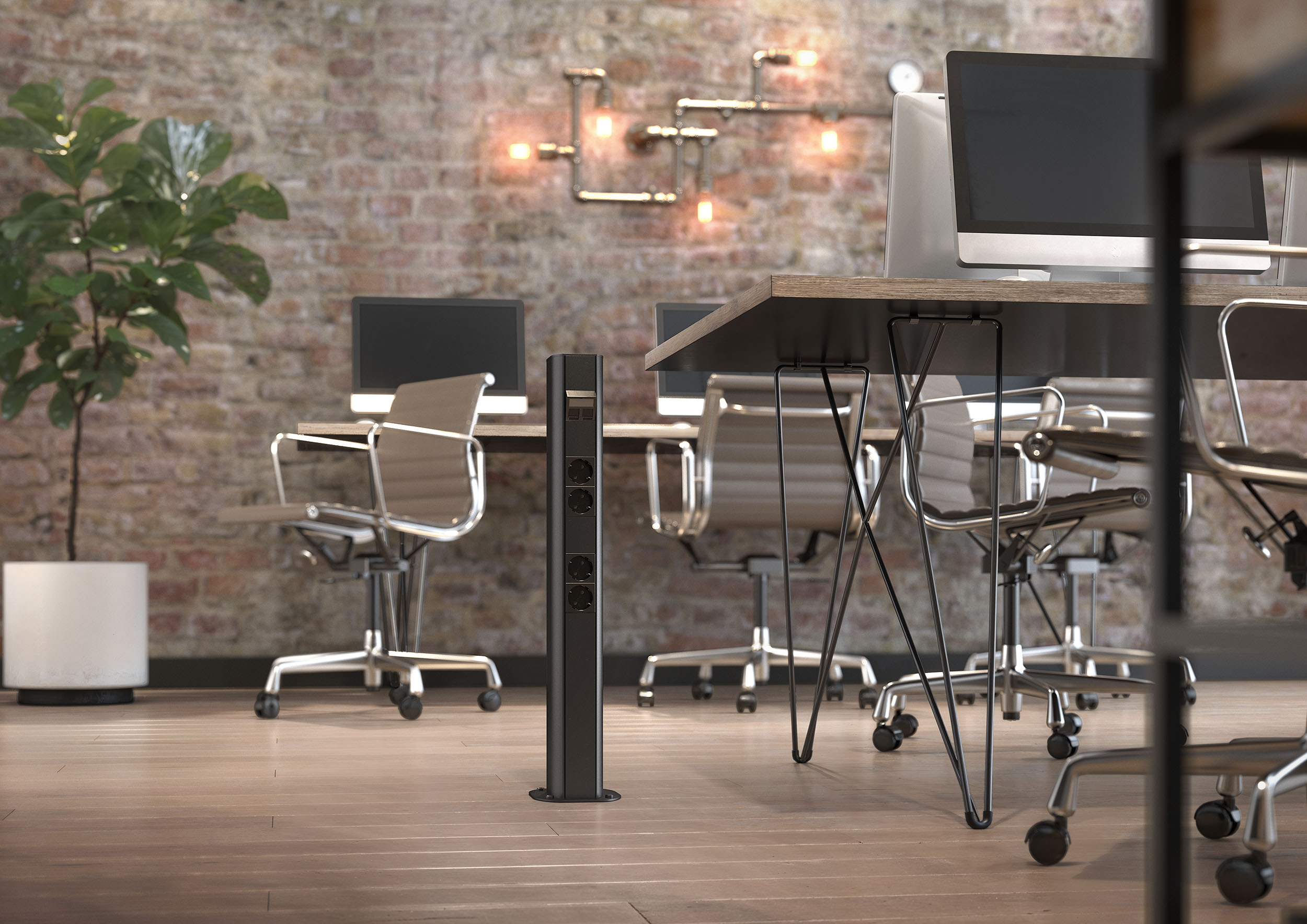 Šie augstākā līmeņa risinājumi harmoniski papildina melno stilu izsmalcinātos interjeros. Tie ne tikai ļauj izvietot kabeļus telpā, iekļaujoties tās dizainā, bet arī nodrošina elektrības un datu pieslēgumu vajadzīgajā vietā. Ja tā atrodas telpas vidū, pēc izvēles varat izmantot dažādus montāžas balstus melnā krāsā, lai nodrošinātu elektrības padevi smalkā, pielāgojamā veidā.
