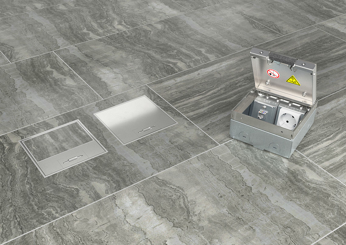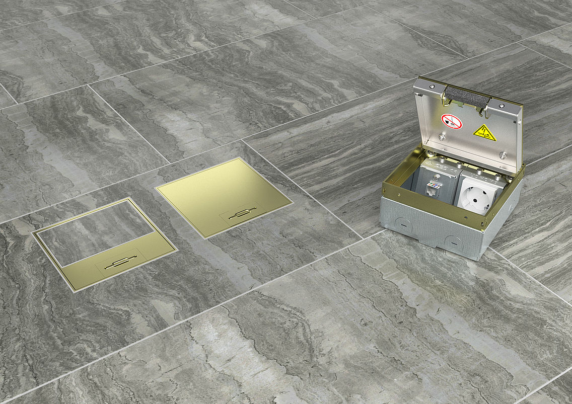 Neatkarīgi no tā, kādu vāka variantu izvēlaties, grīdas kontaktligzdas augstums nav jāpielāgo vai atkārtoti jāregulē. Kabeļi un vadi tiek izvadīti caur vākā integrētu kabeļu izvadu. Pateicoties lodīšu sprūdam vāka malā, vāks nofiksējas grīdas lūkā. Spēcīgs savienojums nodrošina ciešu vāka pozīciju.