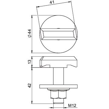 Augstums 58 mm Diametrs 12 mm Garums 43,3 mm Izmērs 44x44x58 Krāsa tērauda Materiāls Nerūsējošais tērauds 1.4301 Metriskā vītne 12 Piemērots montāžas sliedei jā Platums 13 mm Vītne M12x30 - Visi tipi