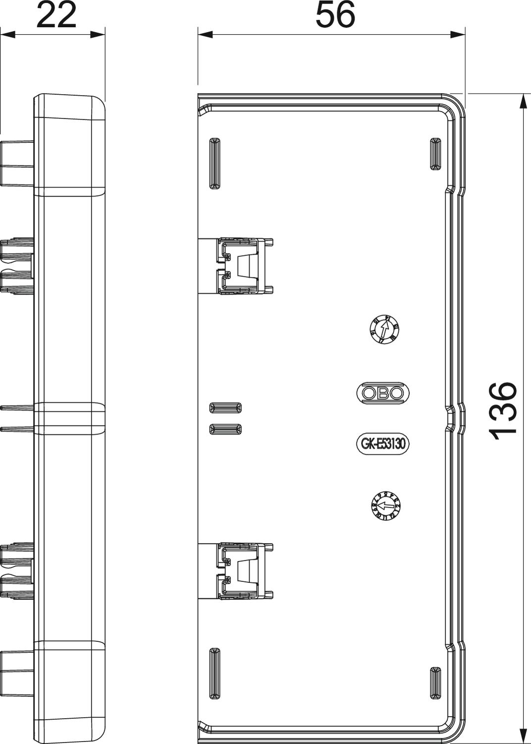 Aizsardzības pakāpes IK kods IK08 Aizsardzības veids IP40 Aizsargplēve nē Antibakteriāla apstrāde nē Augstums 56 mm CO2 pēdas nospiedums (GWP) no šūpuļa līdz vārtiem 0,2258 kg CO2e / 1 Gabals Garums 22 mm Griezuma vietas aizsegšana jā Izmantošanas temperatūras diapazons maks. 60 °C Izmantošanas temperatūras diapazons min. -15 °C Izmērs 136x56x22 Izpildījums Simetrisks Krāsa gaiši pelēks; RAL 7035 Materiāls Polikarbonāts/Acrylnitril-Butadien-Styrol Nesatur halogēnus jā paredzēts kanāla augstumam 53 mm paredzēts kanāla platumam 130 mm Piemērots pa kreisi/pa labi Platums 136 mm Stiprinājuma veids uzstiprināms - Visi tipi