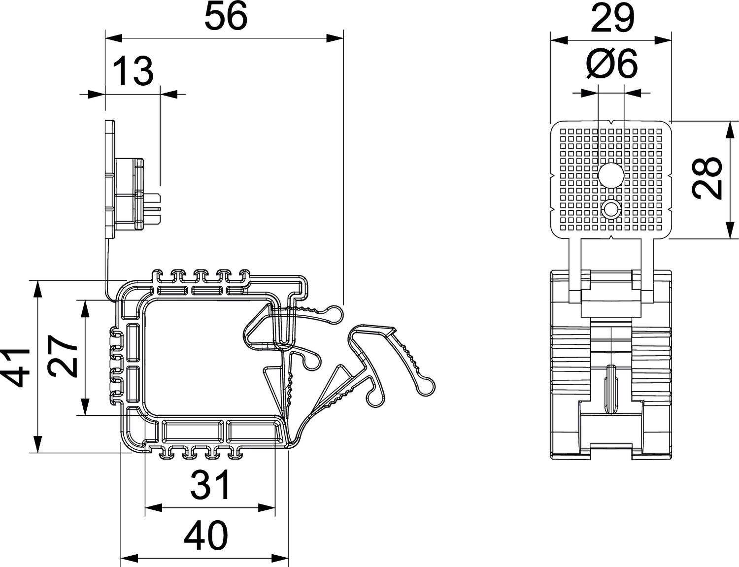 Produkta aprakstsAptverošs stiprinājums ar piepresētu stiprinājuma elementu līdz pat 10 NYM 3 x 1,5 mm² vadu montēšanai pie sienas vai griestiem. Piestiprināšana ar iedzenamu vai iebāžamu dībeli. Piemērota arī stiprināšanai ar gāzes un akumulatora darbinātām zīmolu Bosch, Fischer un Spit stiprināšanas ierīcēm (snīpja iekšējais Ø 7 mm). Stiprinājuma cauruma Ø 6 mm. Ieteicamais stiprināšanas attālums piepildītā stāvoklī 250–400 cm atkarībā no attiecīgajiem spēkā esošajiem valsts noteikumiem/standartiem.