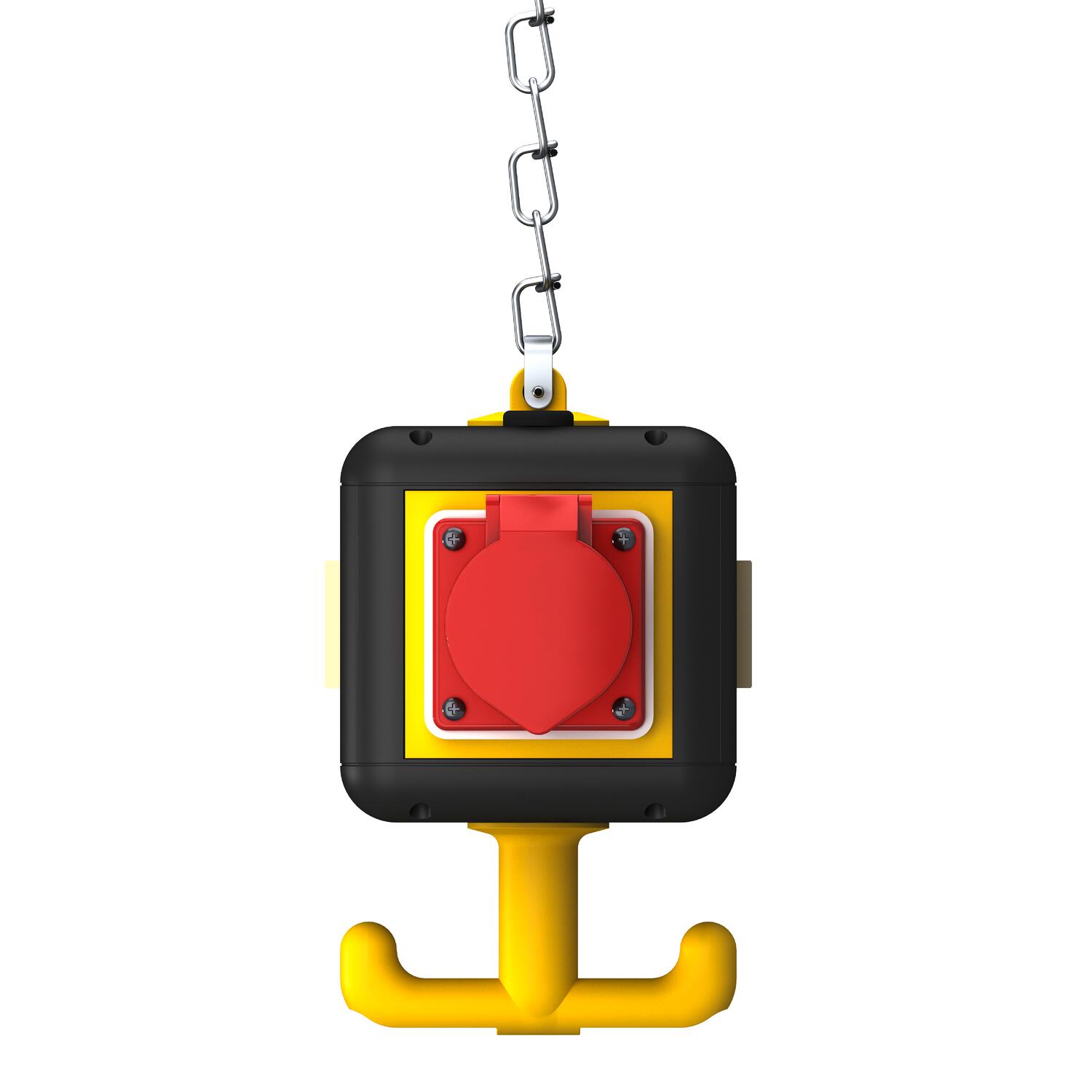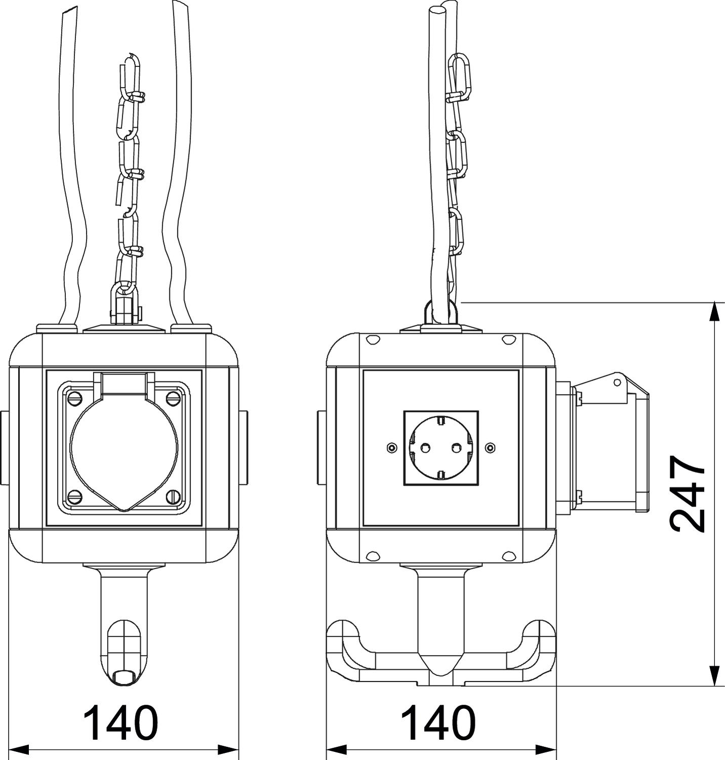 3 x vienvietīgas iezemētas kontaktligzdas, 16 A/250 V ar paaugstinātas drošības pieskāršanās aizsardzību, ar rūpnīcā sagatavotu vadojumu vienai maiņstrāvas ķēdei, pieslēgums ar 1 x spaili, 3 polu, 1 x CEE kontaktligzda, 16 A/415 V, ar starpsienu strāvas ķēžu nodalīšanai.
