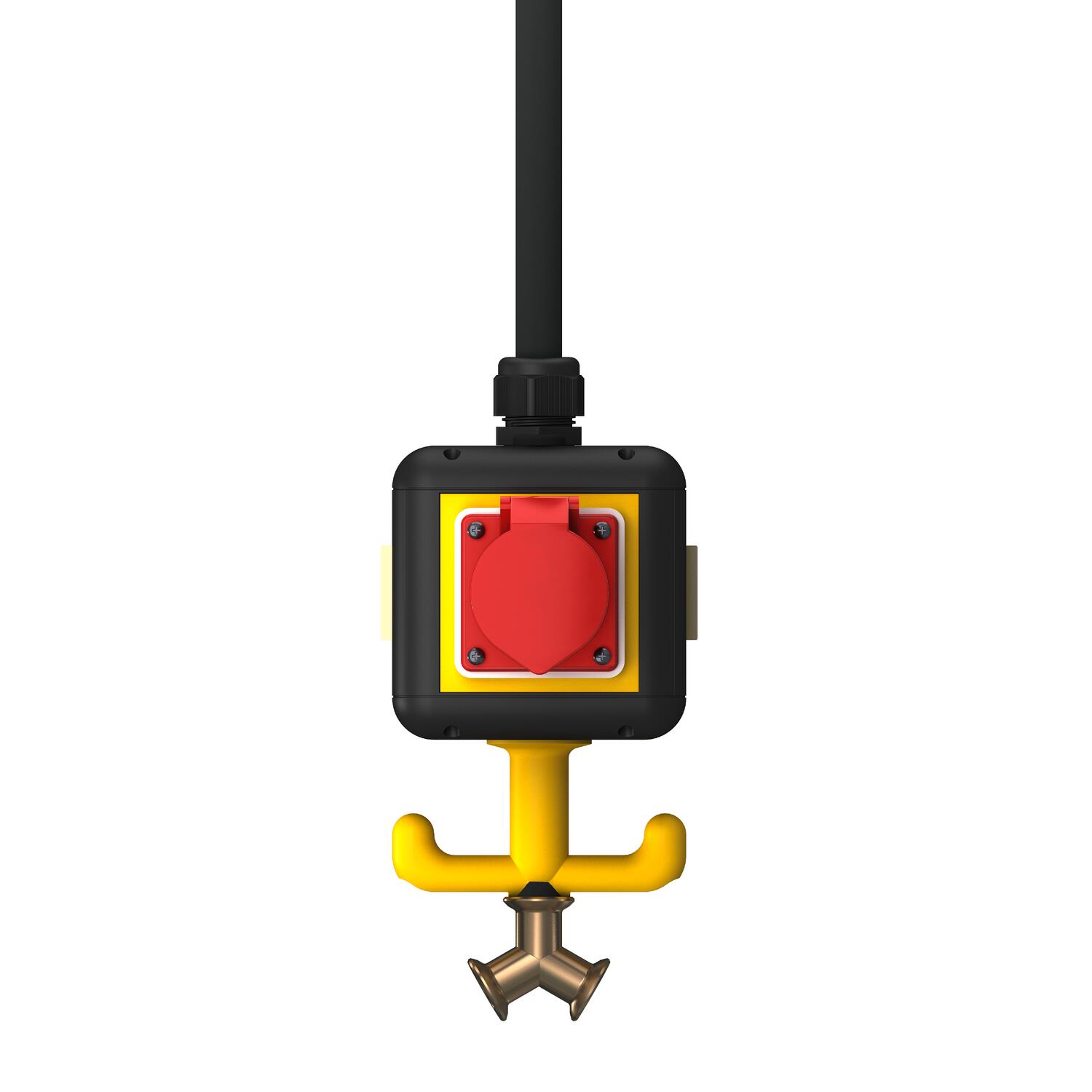 Produkta aprakstsKorpuss, ar aprīkojumu un rūpnīcā sagatavotu vadojumu, ar 1 m cauruli 1/2” un pieslēgumu saspiesta gaisa šļūtenei ar izmēru 13 x 3,5 mm un divvirzienu sadalītāju 1/2”, ar iekares cilpu, roktura āķi un 4 nosegplāksnēm.