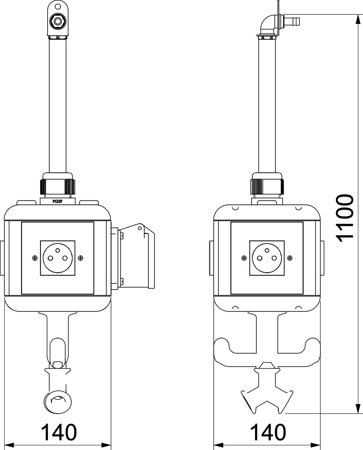 3 x vienvietīgas kontaktligzdas ar zemējuma kontaktu, 16 A/250 V ar paaugstinātas drošības pieskāršanās aizsardzību, ar rūpnīcā sagatavotu vadojumu vienai maiņstrāvas ķēdei, pieslēgums ar 1 x spaili, 3 polu, 1 x CEE kontaktligzdu, 16 A/415 V, ar starpsienu strāvas ķēžu nodalīšanai.