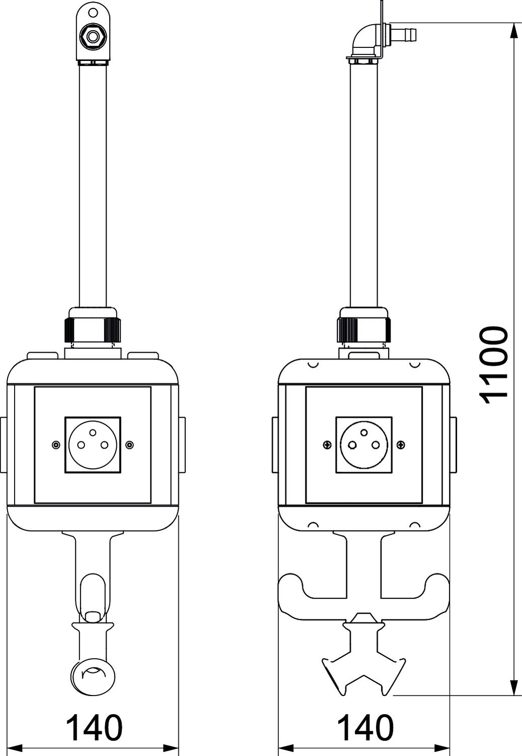 Produkta aprakstsKorpuss, ar aprīkojumu un rūpnīcā sagatavotu vadojumu, ar 1 m cauruli 1/2” un pieslēgumu saspiesta gaisa šļūtenei ar izmēru 13 x 3,5 mm un divvirzienu sadalītāju 1/2”, ar iekares cilpu, roktura āķi un 4 nosegplāksnēm.
