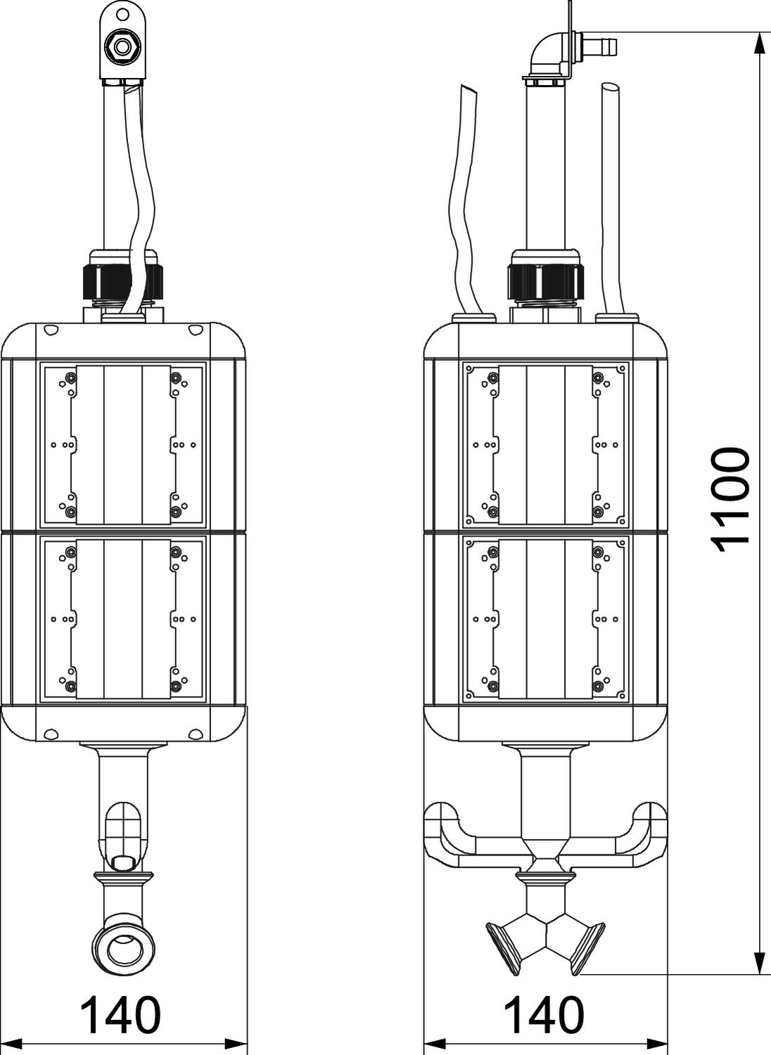 Produkta aprakstsTukšs korpuss ar 1 m cauruli 1/2” un pieslēgumu saspiesta gaisa šļūtenei ar izmēru 13 x 3,5 mm, un divvirzienu sadalītāju 1/2”. Ar uzkaramu cilpu un roktura āķi, elektrisko ražošanas līdzekļu iebūvēšanai, ar pievienotu sadalošo sienu. Bez aizsargplāksnēm.