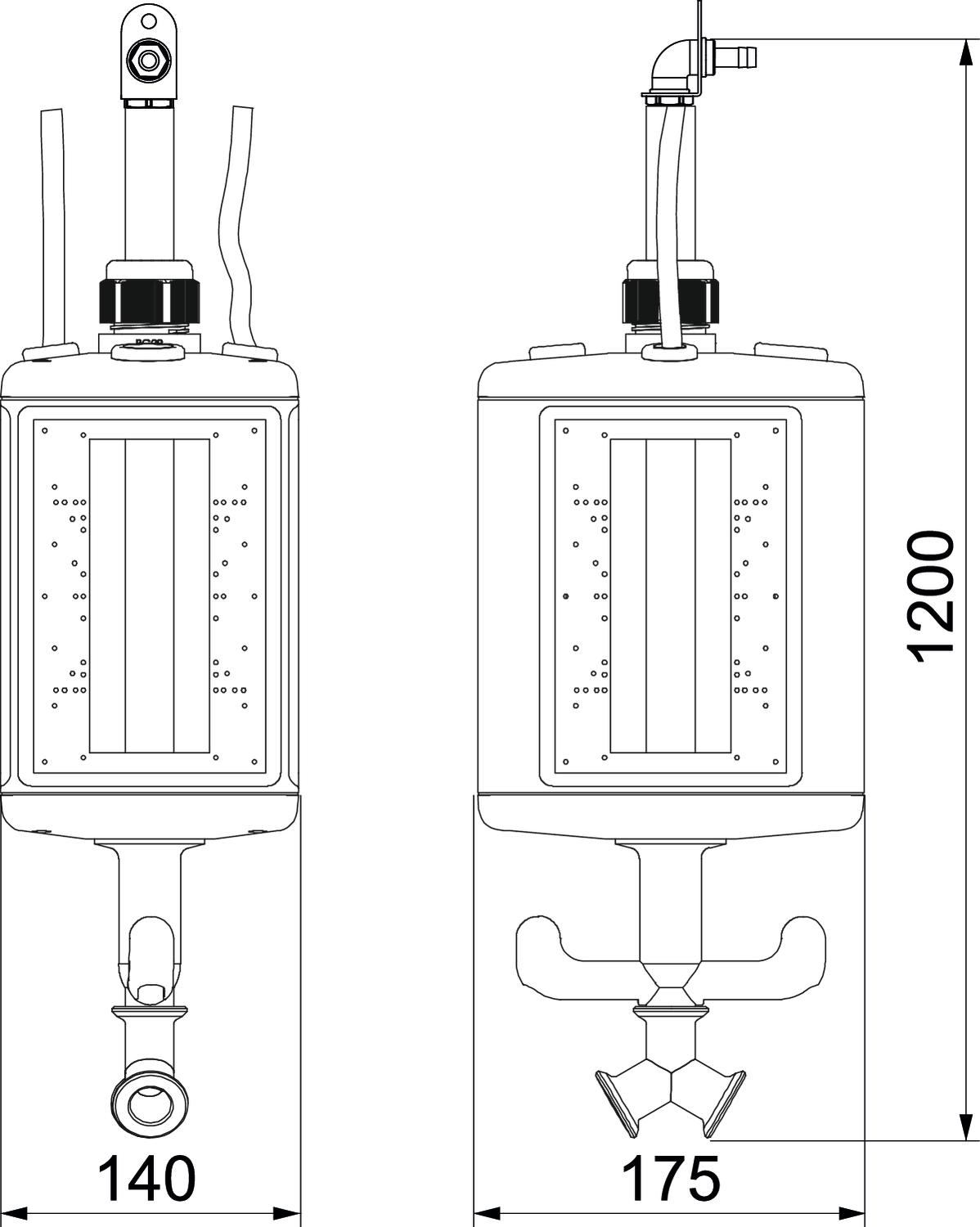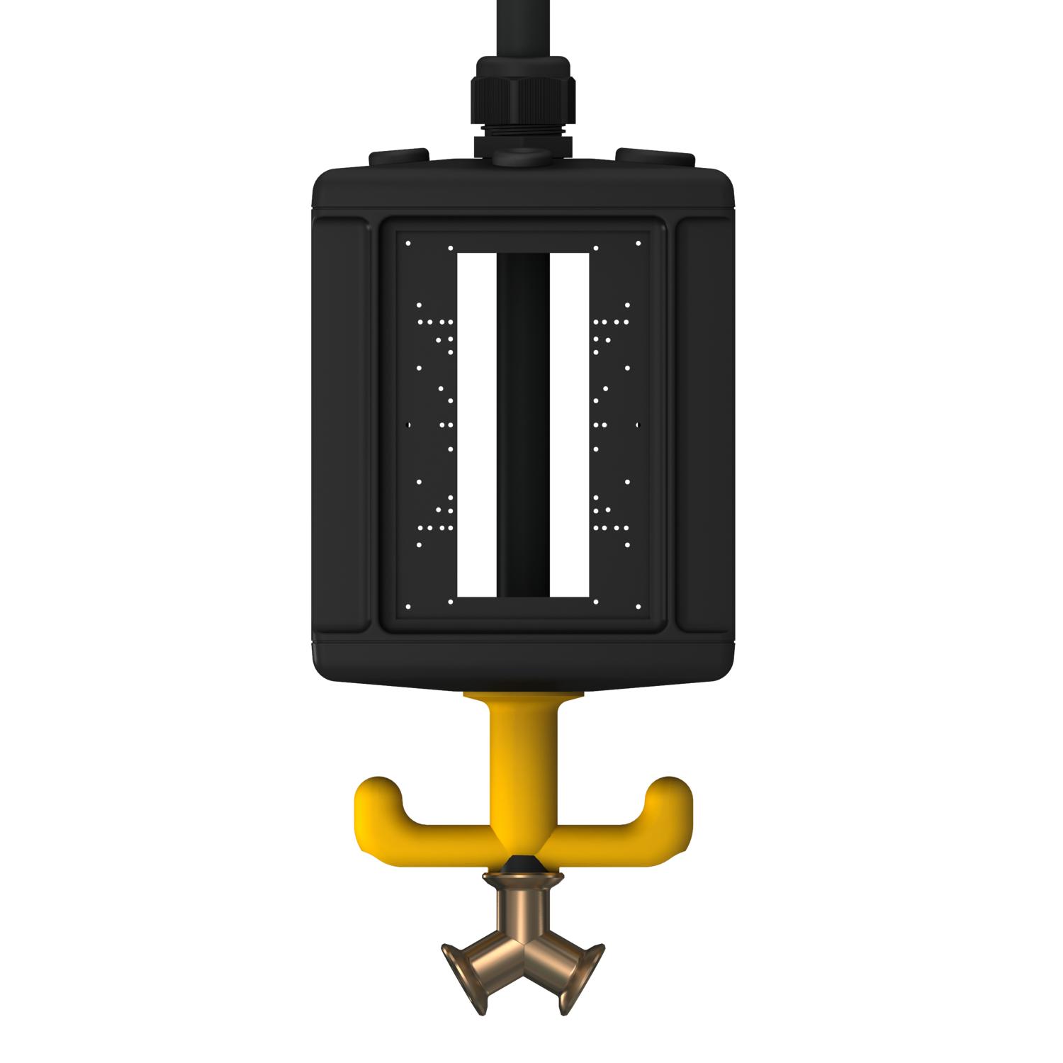 Produkta aprakstsTukšs korpuss ar 1 m cauruli 1/2” un pieslēgumu saspiesta gaisa šļūtenei ar izmēru 13 x 3,5 mm, un divvirzienu sadalītāju 1/2”. Ar uzkaramu cilpu un roktura āķi, elektrisko ražošanas līdzekļu iebūvēšanai, ar pievienotu sadalošo sienu. Bez aizsargplāksnēm. Darba vietu aprīkošanai mitrās vietās. Aizsardzības pakāpe: IP 44.