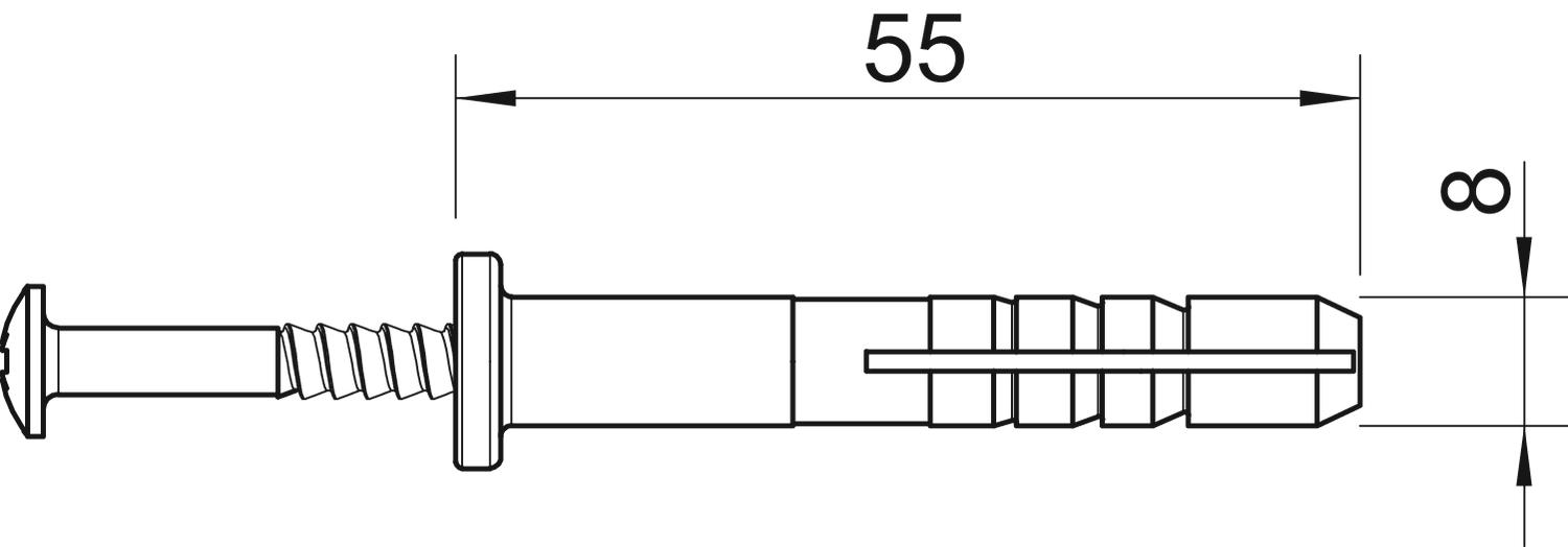 Ar skrūvēm jā Diametrs 8 mm Garums 55 mm Izmērs 8x55mm Izvilkšanas spēks 350 N Krāsa gaiši pelēks Materiāls Poliamīds Nesatur halogēnus jā Skrūvēšanas sistēma Pozidriv PZ Urbtā cauruma dziļums 60 mm - Visi tipi