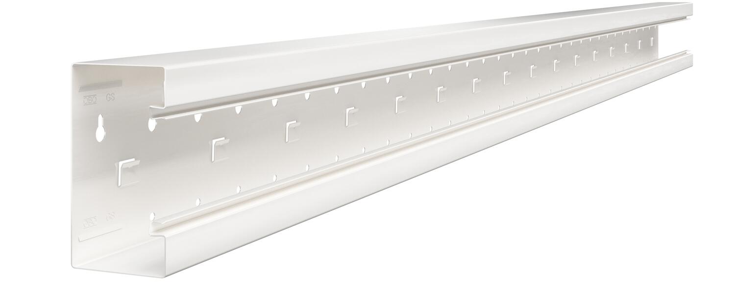 Produkta aprakstsGS ierīču montāžas kanāls, paredzēts montāžai tieši pie sienas vai stiprinājuma konsolēm. GS ierīču montāžas kanāls aprīkots ar savienojumu automātiski izveidojošiem stiprinājuma uzliktņiem, kas ļauj iestiprināt no tērauda loksnes izgatavotu starpsienu. Potenciālu izlīdzināšana starp kanāla apakšējām daļām notiek ar savienojuma starpniecību. Aizsardzības funkciju un potenciālu izlīdzināšanu starp augšējo un apakšējo daļu nodrošina patentēts, automātiski savienojumu izveidojošs kanāla vāks. Sistēmas atveres patiesais izmērs ir 76,5 mm. Augšējā daļa jāpasūta atsevišķi.
