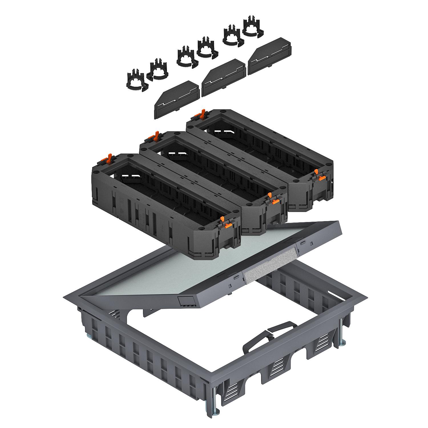 Ierīču montāžas modulis ar paklāja aizsargrāmi, atveramu vāciņu un vadu izeju no poliamīda, krāsots RAL 7011. Vākā izveidots 10 mm izgriezums grīdas segumam (var izmainīt uz 3, 5 vai 8 mm).