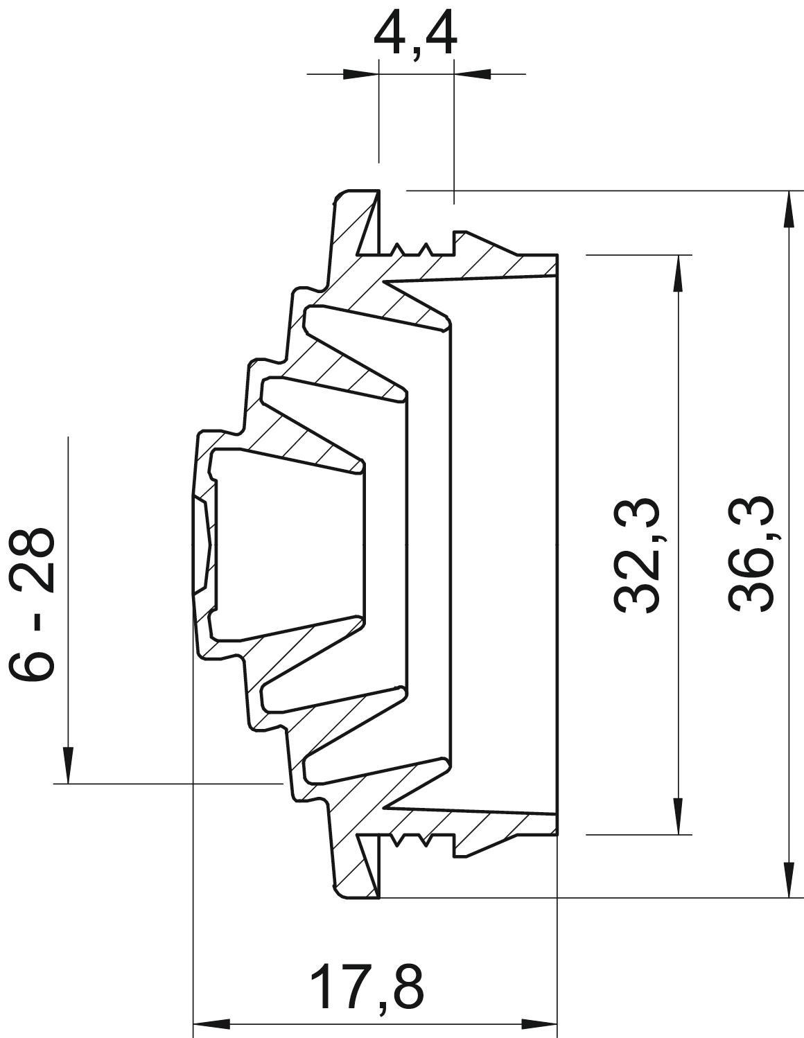 Aizsardzības veids IP54 CO2 pēdas nospiedums (GWP) no šūpuļa līdz vārtiem 0,041 kg CO2e / 1 Gabals diametram maks. 28 mm Dimension D4 10 mm Izmērs M32 Izmērs A 4,4 mm Izmērs D1 36,3 mm Izmērs D2 32,3 mm Izmērs D3 6 mm Izmērs D5 15 mm Izmērs L 17,8 mm Izmērs t 4,4 mm Izpildījums nogriežams Krāsa gaiši pelēks; RAL 7035 Lielums M32 Materiāls Etilēnvinilacetāts Nesatur halogēnus jā Nominālais diametrs 32 mm sienas biezumam maks. 4,4 sienas biezumam min. 4,4 ugunsizturīgs atb. VDE 0471/DIN 695, daļa 2-1, pārbaudes temperatūra 650°C - Visi tipi
