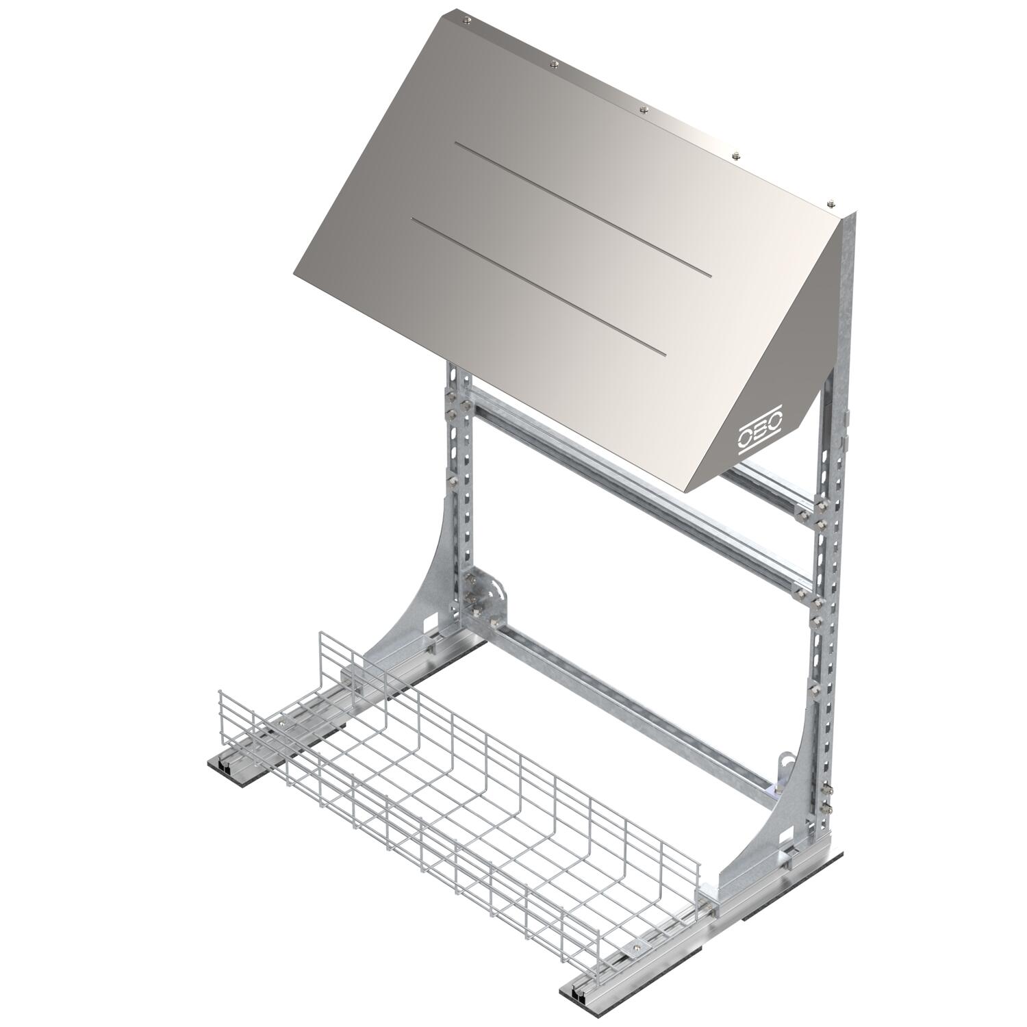 Produkta aprakstsInverter frame for the protected installation of several inverters for PV systems on flat roofs. Free-standing. Mesh cable tray included for ballasting and for the routing of cables.