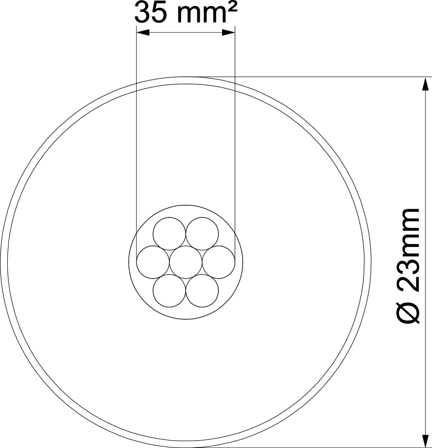 Atsevišķu vadu skaits 7 Diametrs 23 mm Ekvivalentais atdalīšanas attālums s(e)/m 0,9 Izmērs Ø23mm Izolēta konstrukcija, kas iztur augstspriegumu jā Krāsa melns Length tolerance ± 5 % Materiālu apvalks EVA Materiālu īpašības Citi Normāls gredzens (apm. m) 100 Šķērsgriezums 35 mm² - Visi tipi