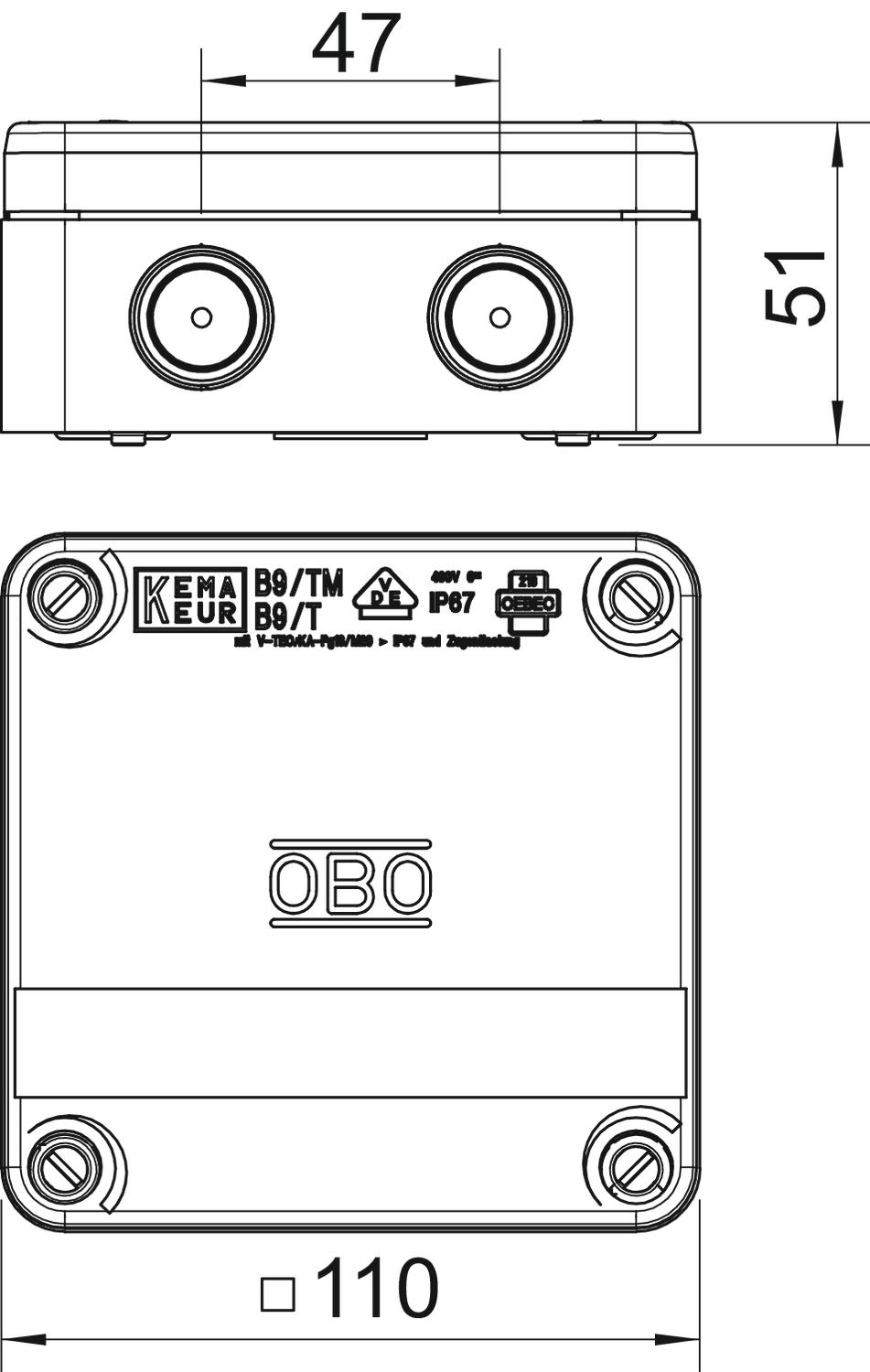 Produkta aprakstsB9/T...: sastāv no diviem dažādiem halogēnus nesaturošiem plastmasas komponentiem, 8 atveres ar vītni (PG16) ar caursitamu pamatnes membrānu (kabeļiem ar diametru līdz 15 mm). Izmantojot kabeļu savienotājus (papildu spriegojuma mazināšana), nav nepieciešamības izņemt membrānu (laika ietaupījums). Aizsardzības klase IP 67, ja ir caurdurama membrāna vai kabeļu skrūvsavienojumi, kur caurduramā membrāna netiek izņemta.
