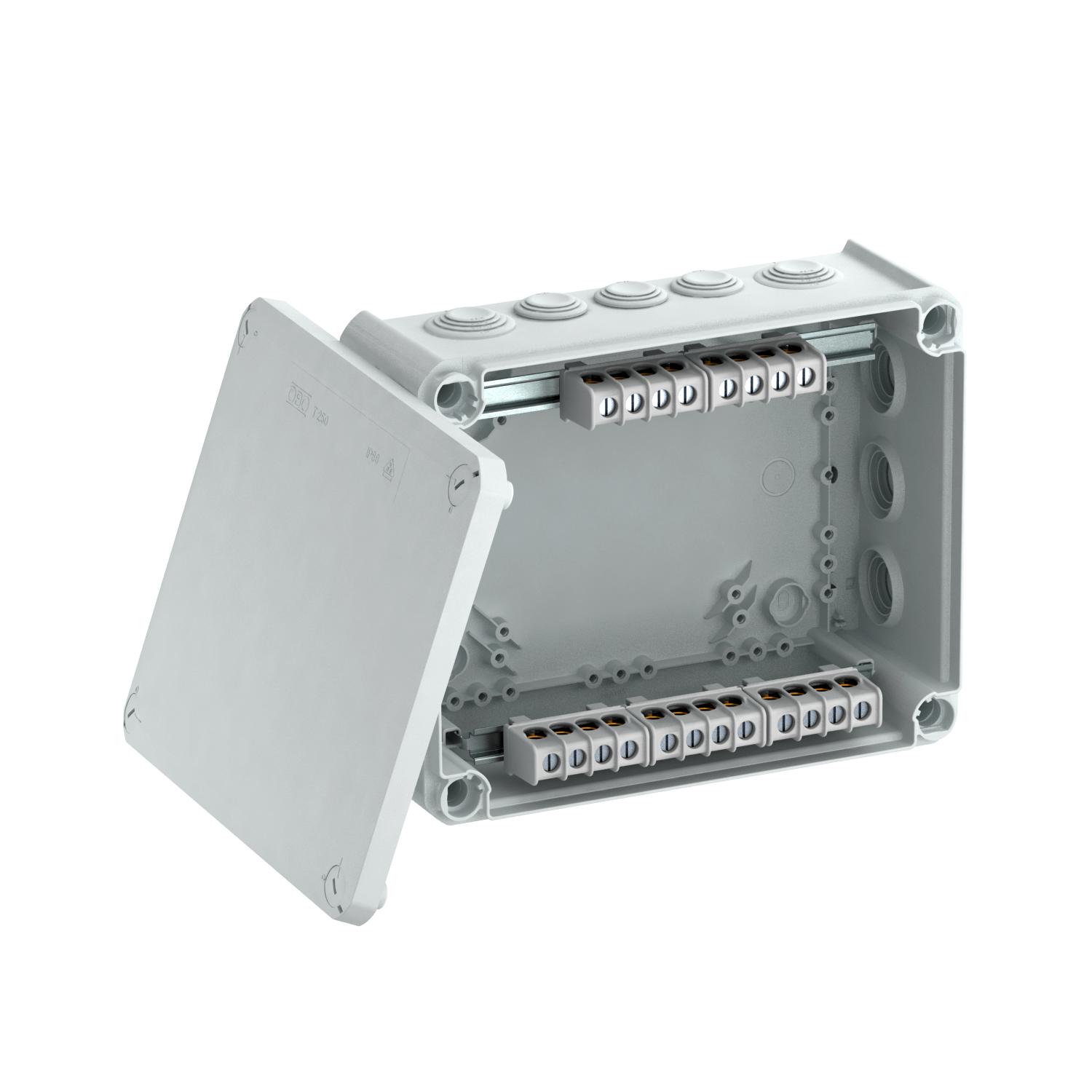Produkta aprakstsKabeļu nozarkārba ar spaiļu līsti kabeļu un vadu savienošanai iekštelpās un aizsargātās ārtelpās. Taisnstūra forma ar iespraužamu blīvi sānos un izsitamiem ievadiem grīdā. Piemērota montāžai pie sienas/griestiem un montāžai uz montāžas plāksnēm un vītni grīdā. Ar iekšējās stiprināšanas iespēju un montāžu ar stūra vākiem. Vāks ar ātro noslēgu, noplombējams. Ražots no materiāliem, kas nesatur halogēnogļūdeņražus un ir izturīgi pret UV starojumu. Kabeļu nozarkārba atbilstoši DIN EN 60670. Ugunsizturīga atbilstoši DIN EN 60695-2-11, pārbaudes temperatūra 650°C. Triecienizturība IK05 atbilstoši DIN EN 50102.