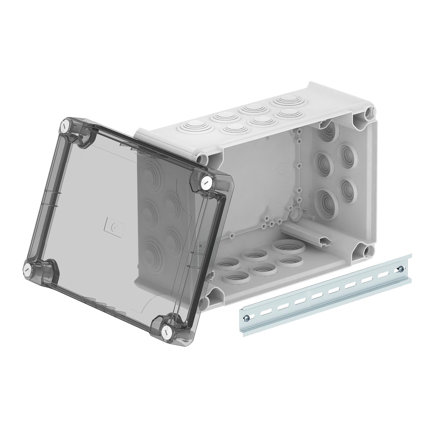 Produkta aprakstsKabeļu nozarkārba kabeļu un vadu savienošanai iekštelpās un aizsargātās ārtelpās. Taisnstūra forma ar ieliekamām blīvēm. Piemērota montāžai pie sienas/griestiem un montāžai uz montāžas plāksnēm un vītni grīdā. Ar iekšējās stiprināšanas iespēju un montāžu ar stūra vākiem. Augsts, caurspīdīgs vāks ar ātro noslēgu, noplombējams. Ražots no materiāliem, kas nesatur halogēnogļūdeņražus un ir izturīgi pret UV starojumu. Ieskaitot U profila montāžas sliedi.