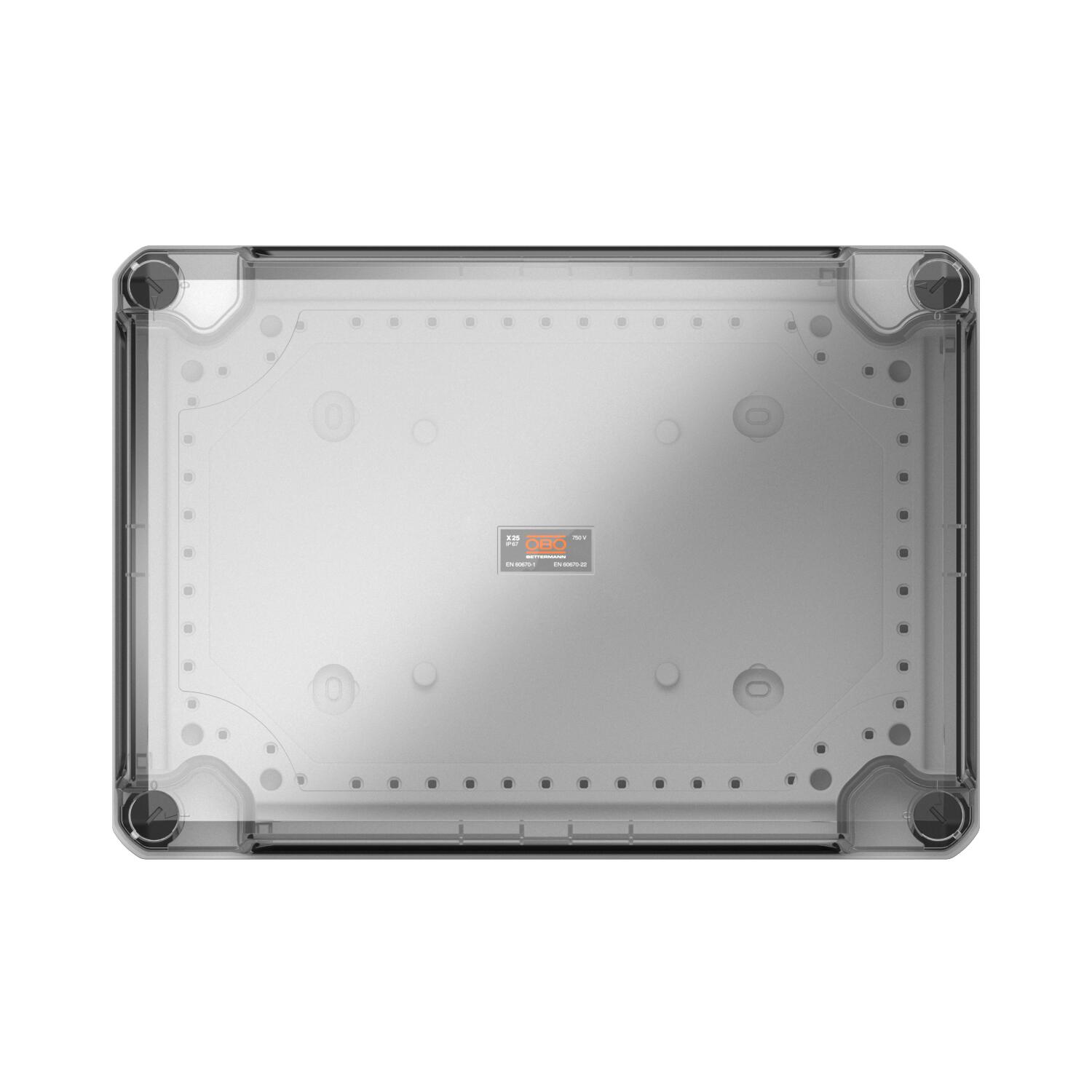 Produkta aprakstsKabeļu nozarkārba kabeļu un vadu savienošanai iekštelpās un ārtelpās. Taisnstūra forma ar izsitamiem ievadiem. Piemērota sienas/griestu montāžai ar iespēju nostiprināt ārpusē, iekšpusē vai montēt ar stūra vākiem. Īpaši triecienizturīgs ar IK08. Caurspīdīgs vāks ar ātro noslēgu, noplombējams. Ražots no materiāliem, kas nesatur halogēnogļūdeņražus un ir izturīgi pret UV starojumu.