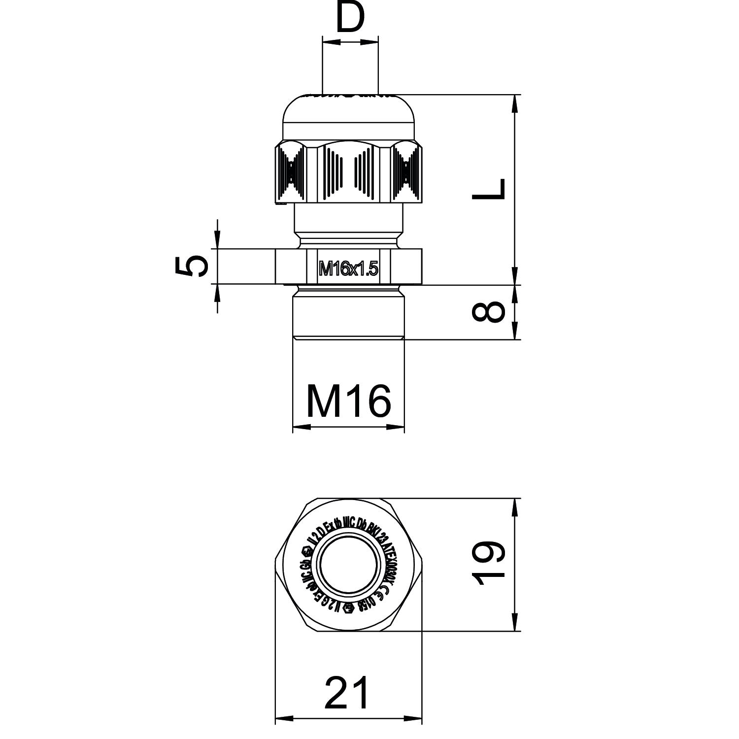 Aizsardzība pret lieci nē Aizsardzības veids IP68 aizsargāta pret eksploziju jā Ar pretuzgriezni nē Atslēgas platums 19 Blīvējuma veids Blīvgredzens Blīvējuma virsma D maks. 8 mm Blīvējuma virsma D min. 5 mm CO2 pēdas nospiedums (GWP) no šūpuļa līdz vārtiem 0,0363 kg CO2e / 1 Gabals Dalāms skrūvsavienojums nē Daudzvietīgs blīvēšanas ieliktnis nē Iespēja atbrīvot no sprieguma nē Izmantošanas temperatūras diapazons maks. 40 °C Izmantošanas temperatūras diapazons min. -10 °C Izmērs L, maks. 27 mm Izmērs L, min. 21 mm Izmērs M16 Izmērs e 21 mm Izmērs G M16 mm Izmērs L1 8 mm Izmērs L2 5 mm Izpildījums taisns Krāsa melns Materiāls Poliamīds Nesatur halogēnus jā Nestabils griezes moments 2,75 Nm Plakanvada skrūvsavienojums nē Sešstūra stūra izmērs 21 mm sprādzienbīstamai zonai yes sprādzienbīstamai zonai, gāze 1, 2 sprādzienbīstamai zonai, putekļi 21, 22 Stiegrots ar stikla šķiedru nē Triecienizturīgs nē Vītne M16 x 1,5 Vītnes garums 8 mm Vītnes iekšējais izmērs 16 Vītnes kāpe 1,5 mm Vītnes veids metrisks - Visi tipi
