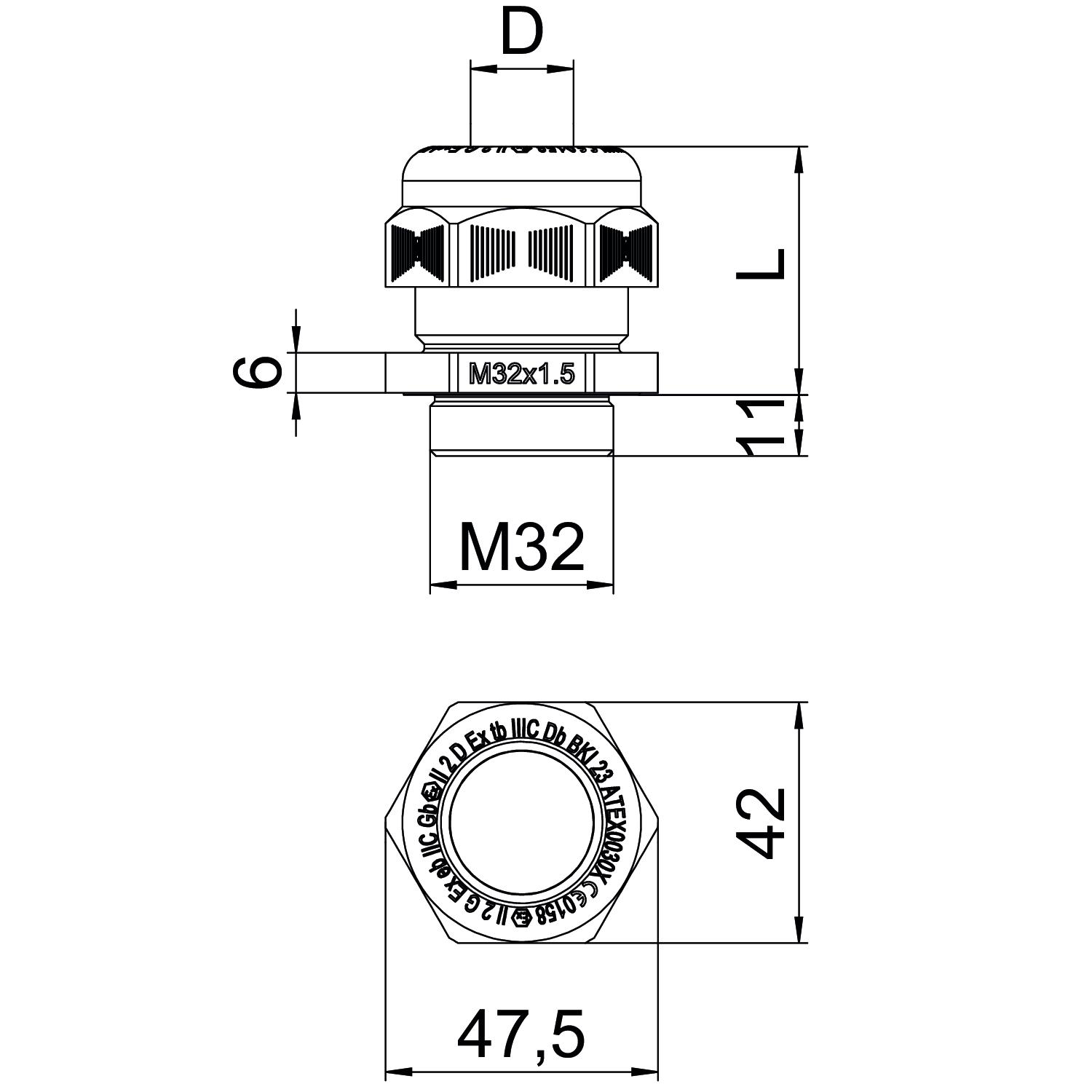Aizsardzība pret lieci nē Aizsardzības veids IP68 aizsargāta pret eksploziju jā Ar pretuzgriezni nē Atslēgas platums 42 Blīvējuma veids Blīvgredzens Blīvējuma virsma D maks. 25 mm Blīvējuma virsma D min. 20 mm CO2 pēdas nospiedums (GWP) no šūpuļa līdz vārtiem 0,1694 kg CO2e / 1 Gabals Dalāms skrūvsavienojums nē Daudzvietīgs blīvēšanas ieliktnis nē Iespēja atbrīvot no sprieguma nē Izmantošanas temperatūras diapazons maks. 65 °C Izmantošanas temperatūras diapazons min. -20 °C Izmērs L, maks. 43 mm Izmērs L, min. 32 mm Izmērs M32 Izmērs e 47,5 mm Izmērs G M32 mm Izmērs L1 11 mm Izmērs L2 7 mm Izpildījums taisns Krāsa melns Materiāls Poliamīds Nesatur halogēnus jā Nestabils griezes moments 12 Nm Plakanvada skrūvsavienojums nē Sešstūra stūra izmērs 47,5 mm sprādzienbīstamai zonai yes sprādzienbīstamai zonai, gāze 1, 2 sprādzienbīstamai zonai, putekļi 21, 22 Stiegrots ar stikla šķiedru nē Triecienizturīgs nē Vītne M32 x 1,5 Vītnes garums 11 mm Vītnes iekšējais izmērs 32 Vītnes kāpe 1,5 mm Vītnes veids metrisks - Visi tipi