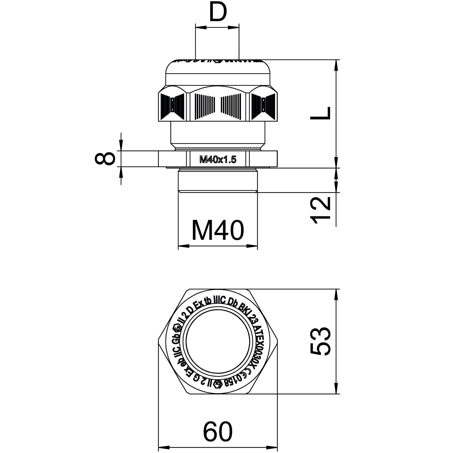 Aizsardzība pret lieci nē Aizsardzības veids IP68 aizsargāta pret eksploziju jā Ar pretuzgriezni nē Atslēgas platums 53 Blīvējuma veids Blīvgredzens Blīvējuma virsma D maks. 32 mm Blīvējuma virsma D min. 25 mm CO2 pēdas nospiedums (GWP) no šūpuļa līdz vārtiem 0,3243 kg CO2e / 1 Gabals Dalāms skrūvsavienojums nē Daudzvietīgs blīvēšanas ieliktnis nē Iespēja atbrīvot no sprieguma nē Izmantošanas temperatūras diapazons maks. 65 °C Izmantošanas temperatūras diapazons min. -20 °C Izmērs L, maks. 54 mm Izmērs L, min. 39 mm Izmērs M40 Izmērs e 60 mm Izmērs G M40 mm Izmērs L1 13 mm Izmērs L2 8 mm Izpildījums taisns Krāsa melns Materiāls Poliamīds Nesatur halogēnus jā Nestabils griezes moments 15 Nm Plakanvada skrūvsavienojums nē Sešstūra stūra izmērs 60 mm sprādzienbīstamai zonai yes sprādzienbīstamai zonai, gāze 1, 2 sprādzienbīstamai zonai, putekļi 21, 22 Stiegrots ar stikla šķiedru nē Triecienizturīgs nē Vītne M40 x 1,5 Vītnes garums 13 mm Vītnes iekšējais izmērs 40 Vītnes kāpe 1,5 mm Vītnes veids metrisks - Visi tipi