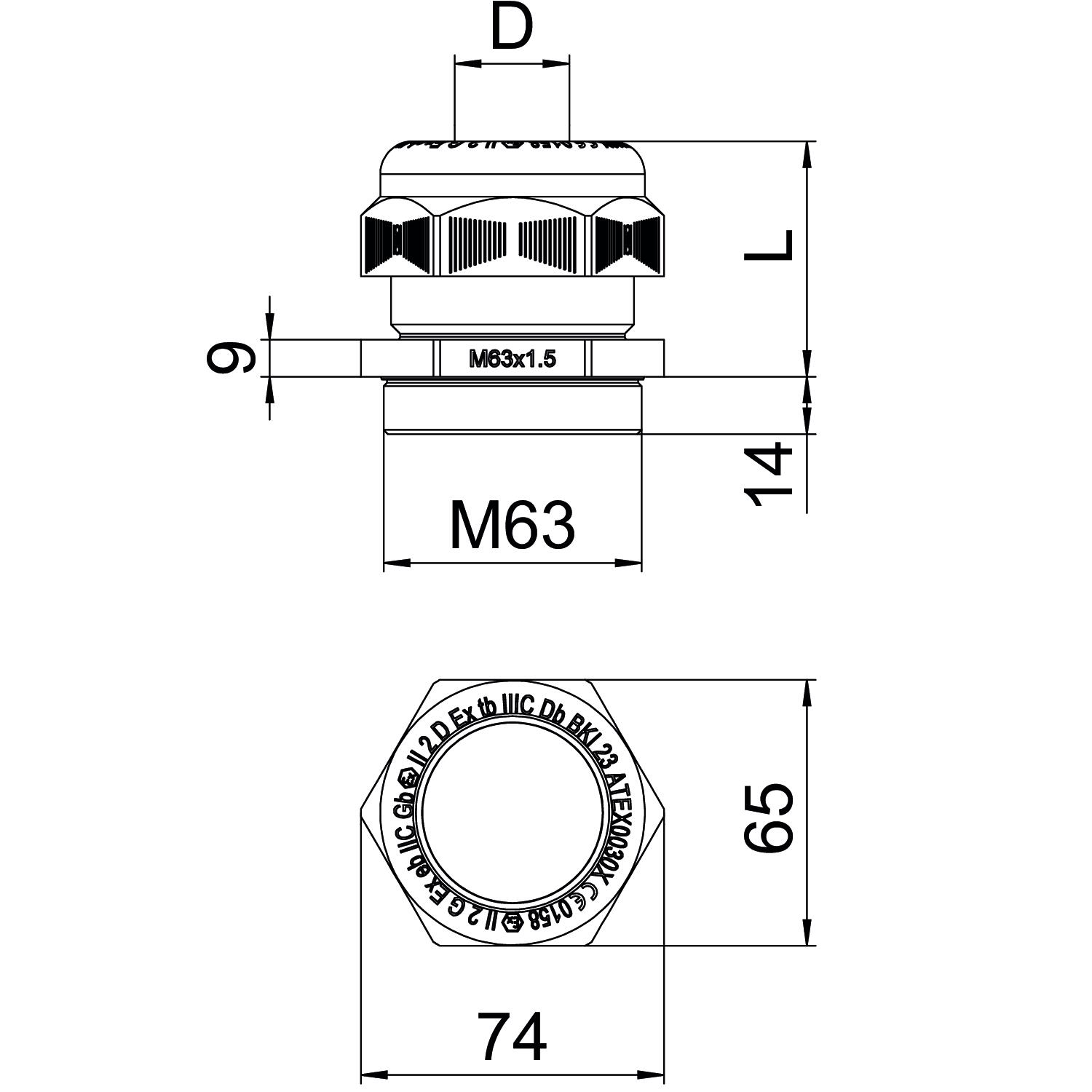 Aizsardzība pret lieci nē Aizsardzības veids IP68 aizsargāta pret eksploziju jā Ar pretuzgriezni nē Atslēgas platums 65 Blīvējuma veids Blīvgredzens Blīvējuma virsma D maks. 44 mm Blīvējuma virsma D min. 36 mm CO2 pēdas nospiedums (GWP) no šūpuļa līdz vārtiem 0,4471 kg CO2e / 1 Gabals Dalāms skrūvsavienojums nē Daudzvietīgs blīvēšanas ieliktnis nē Iespēja atbrīvot no sprieguma nē Izmantošanas temperatūras diapazons maks. 65 °C Izmantošanas temperatūras diapazons min. -20 °C Izmērs L, maks. 58 mm Izmērs L, min. 42 mm Izmērs M63 Izmērs e 74 mm Izmērs G M63 mm Izmērs L1 14 mm Izmērs L2 9 mm Izpildījums taisns Krāsa melns Materiāls Poliamīds Nesatur halogēnus jā Nestabils griezes moments 22 Nm Plakanvada skrūvsavienojums nē Sešstūra stūra izmērs 74 mm sprādzienbīstamai zonai yes sprādzienbīstamai zonai, gāze 1, 2 sprādzienbīstamai zonai, putekļi 21, 22 Stiegrots ar stikla šķiedru nē Triecienizturīgs nē Vītne M63 x 1,5 Vītnes garums 14 mm Vītnes iekšējais izmērs 63 Vītnes kāpe 1,5 mm Vītnes veids metrisks - Visi tipi