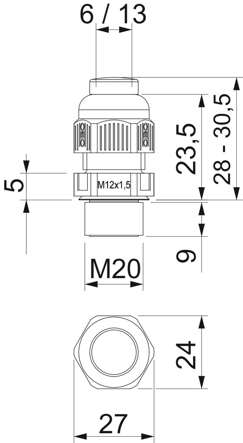 Aizsardzība pret lieci nē Aizsardzības veids IP68 aizsargāta pret eksploziju nē Ar pretuzgriezni nē Atslēgas platums 24 Atslēgas platums 1 24 mm Augstums 27 mm Blīvējuma veids Blīvgredzens Blīvējuma virsma D maks. 13 mm Blīvējuma virsma D min. 6 mm CO2 pēdas nospiedums (GWP) no šūpuļa līdz vārtiem 0,0495 kg CO2e / 1 Gabals Dalāms skrūvsavienojums nē Daudzvietīgs blīvēšanas ieliktnis nē Garums 28 mm Iespēja atbrīvot no sprieguma jā Izmantošanas temperatūras diapazons maks. 65 °C Izmantošanas temperatūras diapazons min. -20 °C Izmērs L, maks. 30,5 mm Izmērs L, min. 28 mm Izmērs M20 Izmērs e 27 mm Izmērs L1 9 mm Izmērs L2 5 mm Izmērs L3 23,5 mm Izpildījums taisns Krāsa gaiši pelēks; RAL 7035 Materiāls Poliamīds Nesatur halogēnus jā Nestabils griezes moments 3,8 Nm Plakanvada skrūvsavienojums nē Platums 24 mm Sešstūra stūra izmērs 27 mm sprādzienbīstamai zonai bez sprādzienbīstamai zonai, gāze bez sprādzienbīstamai zonai, putekļi bez Stiegrots ar stikla šķiedru nē Triecienizturīgs nē ugunsizturīgs atb. VDE 0471/DIN 695, daļa 2-1, pārbaudes temperatūra 650°C Vītne M20 x 1,5 Vītnes garums 10 mm Vītnes iekšējais izmērs 20 Vītnes kāpe 1,5 mm Vītnes veids metrisks - Visi tipi
