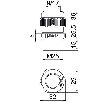 Aizsardzība pret lieci nē Aizsardzības veids IP68 aizsargāta pret eksploziju nē Ar pretuzgriezni nē Atslēgas platums 29 Blīvējuma veids Blīvgredzens Blīvējuma virsma D maks. 17 mm Blīvējuma virsma D min. 9 mm CO2 pēdas nospiedums (GWP) no šūpuļa līdz vārtiem 0,0688 kg CO2e / 1 Gabals Dalāms skrūvsavienojums nē Daudzvietīgs blīvēšanas ieliktnis nē Iespēja atbrīvot no sprieguma jā Izmantošanas temperatūras diapazons maks. 65 °C Izmantošanas temperatūras diapazons min. -20 °C Izmērs L, maks. 36 mm Izmērs L, min. 25,5 mm Izmērs M25 Izmērs e 32 mm Izmērs L1 15 mm Izmērs L2 6 mm Izpildījums taisns Krāsa gaiši pelēks; RAL 7035 Materiāls Poliamīds Nesatur halogēnus jā Nestabils griezes moments 5 Nm Plakanvada skrūvsavienojums nē Sešstūra stūra izmērs 32 mm sprādzienbīstamai zonai bez sprādzienbīstamai zonai, gāze bez sprādzienbīstamai zonai, putekļi bez Stiegrots ar stikla šķiedru nē Triecienizturīgs nē ugunsizturīgs atb. VDE 0471/DIN 695, daļa 2-1, pārbaudes temperatūra 650°C Vītne M25 x 1,5 Vītnes garums 15 mm Vītnes iekšējais izmērs 25 Vītnes kāpe 1,5 mm Vītnes veids metrisks - Visi tipi