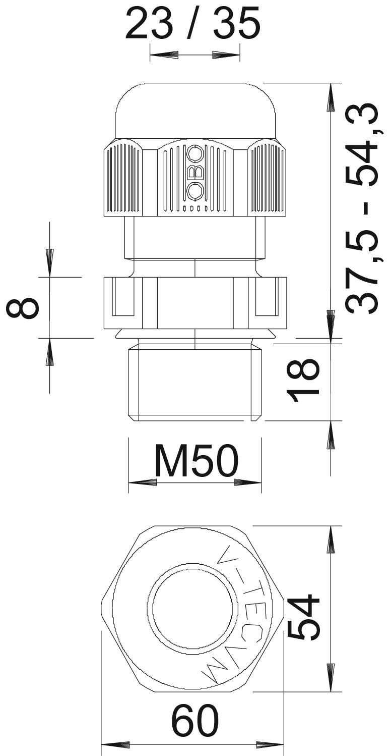 Aizsardzība pret lieci nē Aizsardzības veids IP68 aizsargāta pret eksploziju nē Ar pretuzgriezni nē Atslēgas platums 54 Blīvējuma veids Blīvgredzens Blīvējuma virsma D maks. 35 mm Blīvējuma virsma D min. 23 mm CO2 pēdas nospiedums (GWP) no šūpuļa līdz vārtiem 0,3381 kg CO2e / 1 Gabals Dalāms skrūvsavienojums nē Daudzvietīgs blīvēšanas ieliktnis nē Iespēja atbrīvot no sprieguma jā Izmantošanas temperatūras diapazons maks. 65 °C Izmantošanas temperatūras diapazons min. -20 °C Izmērs L, maks. 54,3 mm Izmērs L, min. 37,5 mm Izmērs M50 Izmērs e 60 mm Izmērs L1 18 mm Izmērs L2 8 mm Izpildījums taisns Krāsa melns Materiāls Poliamīds Nesatur halogēnus jā Nestabils griezes moments 12 Nm Plakanvada skrūvsavienojums nē Sešstūra stūra izmērs 60 mm sprādzienbīstamai zonai bez sprādzienbīstamai zonai, gāze bez sprādzienbīstamai zonai, putekļi bez Stiegrots ar stikla šķiedru nē Triecienizturīgs nē ugunsizturīgs atb. VDE 0471/DIN 695, daļa 2-1, pārbaudes temperatūra 650°C Vītne M50 x 1,5 Vītnes garums 18 mm Vītnes iekšējais izmērs 50 Vītnes kāpe 1,5 mm Vītnes veids metrisks - Visi tipi
