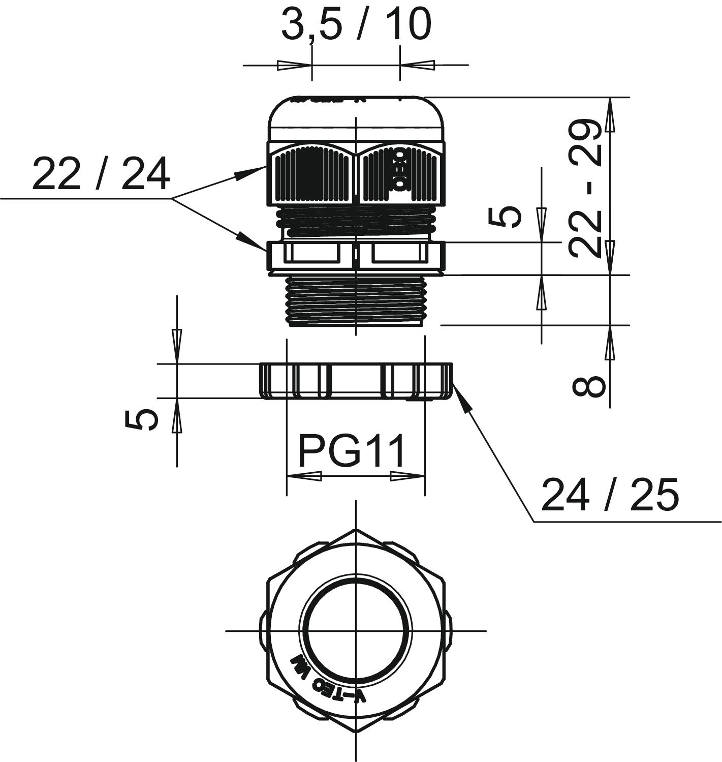 Produkta aprakstsKabeļu skrūvsavienojums ar PG savienojuma vītni ar kupoluzgriežņa konstrukciju, kabeļu nozarkārbām, korpusiem, sadalītāju kārbām privātā un ražošanas jomā. Ar kabeļa ievades fiksatoru un integrētu blīvēšanas mēlīti, sertificētu atbilstoši DIN EN 62444. Aizsardzības klase IP68. Izmantojams no -20°C līdz +65°C. Ieskaitot kontaktuzgriezni.