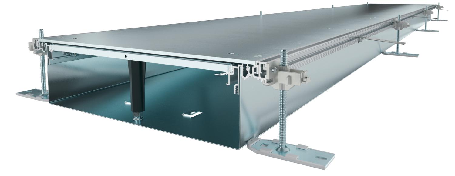 Produkta aprakstsMontāžai gatavs kanāla posms ar 3 pašfiksējošiem noslēgvākiem vadu ievilkšanai, sastāv no kanāla apakšdaļas (grīdā montējama rene ar sānu profiliem un grīdas seguma salaidumprofiliem) un kanāla vāka. Grīdā montējama rene ar stiprinājuma mēlītēm starpliku pašfiksējošai montāžai. Piegādes komplektā ietilpst 6 augstumā regulējami stiprinājuma leņķi, 6 betona enkuri un vāka savienojuma blīves (3 gab. kanāliem ar nominālo platumu 200 un 300) vai augstumā regulējami vāka savienojuma balsti: 3 gab. kanāliem ar nominālo platumu 400 un 6 gab. kanāliem ar nominālo platumu 500 un 600. Piegādājot kanāla vāki ir pieskrūvēti un fiksācijas elementi ir piemontēti