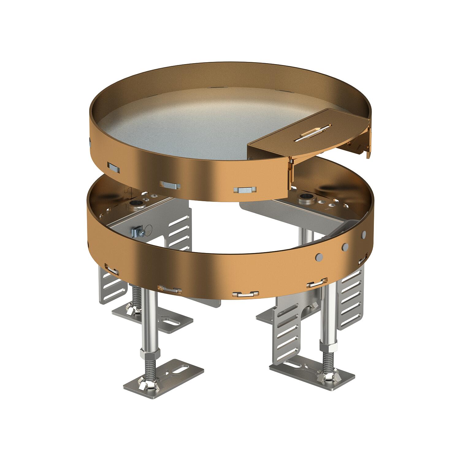 Kasete ar regulējamu augstumu ar vadu izeju, 2 sekciju. Var uzstādīt 2 APMT2 nosegplāksnes. 2 universālo balstu UT3 montāžai 4 atsevišķām instalācijas ierīcēm ar balstgredzenu/stīpas veida rokturi vai 6 Modul 45 ierīcēm.