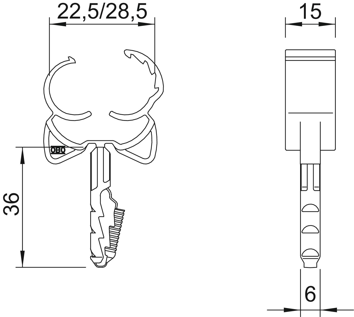 CO2 pēdas nospiedums (GWP) no šūpuļa līdz vārtiem 0,0308 kg CO2e / 1 Gabals Izmērs 22,5-28,5mm Izpildījums slēgts Krāsa gaiši pelēks; RAL 7035 Materiāls Poliamīds Nesatur halogēnus jā Pārraušanas spēks betonā B25 500 N Spriegošanas diapazons D maks. 28,5 mm Spriegošanas diapazons D min. 22,5 mm Stiprinājuma veids Spraužams stiprinājums Urbtā cauruma diametrs min. 6 mm Urbtā cauruma dziļums 40 mm - Visi tipi