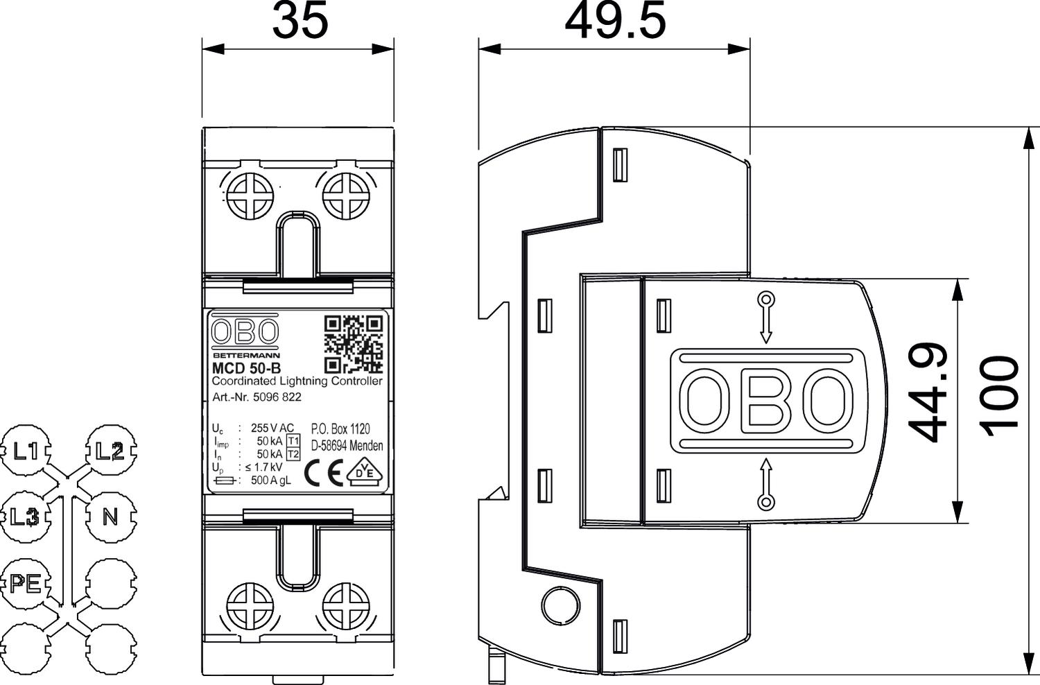• Zibens strāvas novadīšanas spēja 50 kA (10/350) katram polam, kopā līdz 150 kA (10/350)