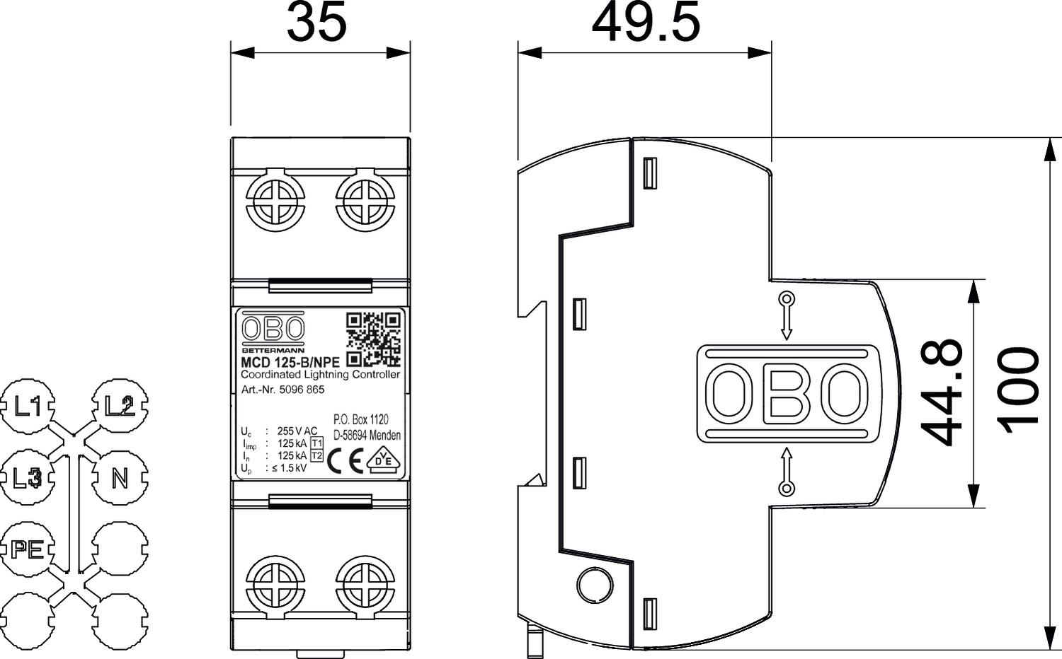 MCD 125-B/NPE: koordinēta N-PE dzirksteļsprauga, tips 1+2 atb. EN 61643-11. Pieslēgvietai 0 uz 2 (LPZ) saskaņā ar zibensaizsardzības zonu koncepciju, atb. IEC 61312-1 vai VDE 0185-305.