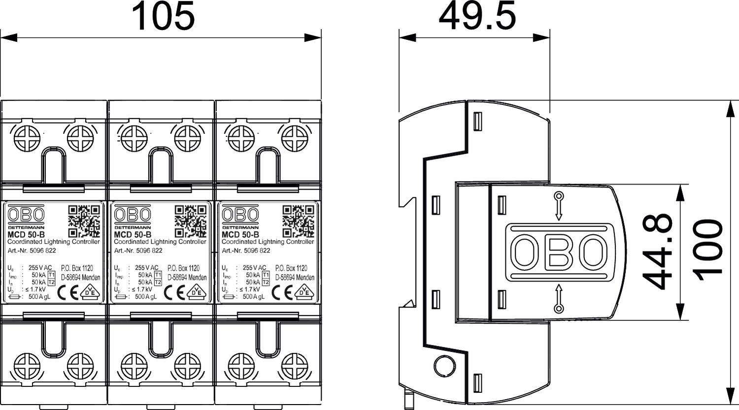 3 x MCD 50-B: koordinēts zibens novadītājs, tips 1+2 EN 61643-11. Pieslēgvietai 0 uz 2 (LPZ) saskaņā ar zibensaizsardzības zonu koncepciju, atb. IEC 61312-1 vai VDE 0185-305.