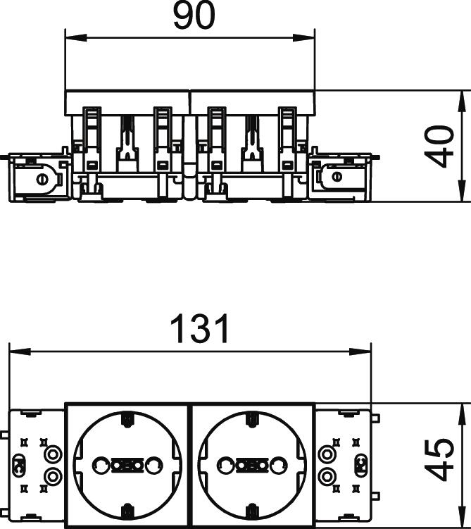 Produkta aprakstsIezemēta kontaktligzda ar pieslēgumu no sāniem Divvietīga 0°, ar paaugstinātu aizsardzību pret pieskaršanos, ar kontaktspailēm, 2 polu, 16 A, 250 V~, ar savienošanas spailēm atb. IEC 60884-1, piemērota ierīču montāžas kanālu sistēmas Rapid 45 ierīkošanai.