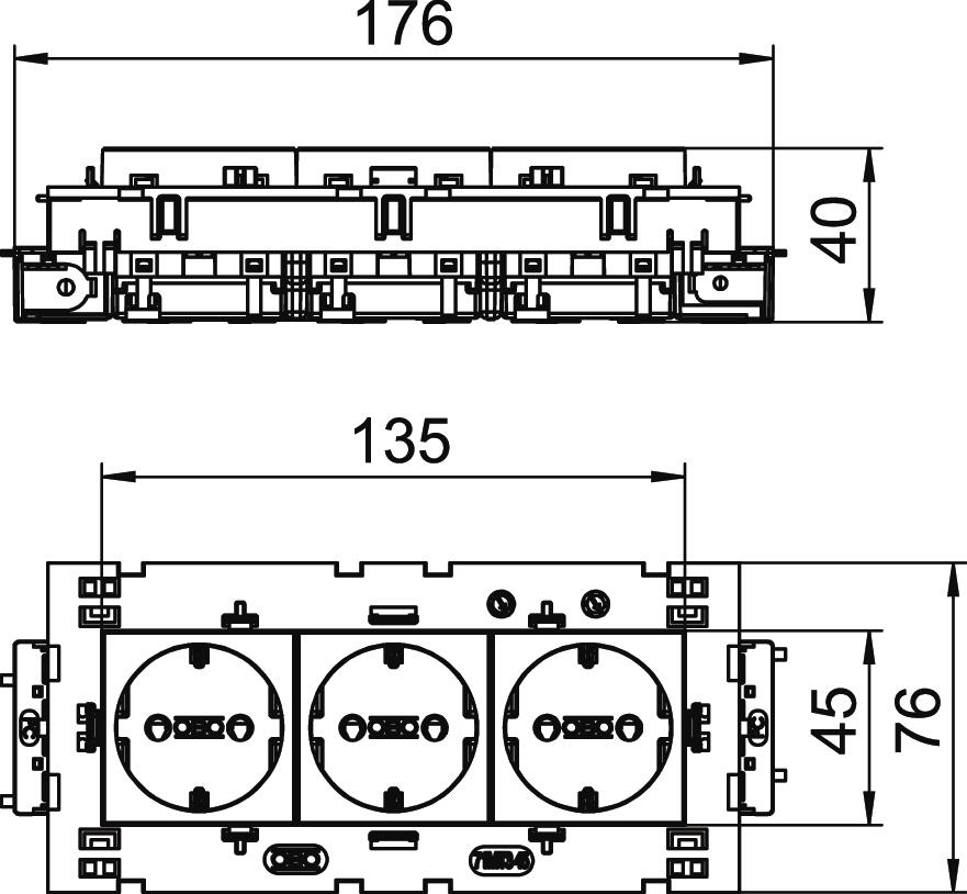 Produkta aprakstsIezemēta kontaktligzda ar pieslēgumu no sāniem Trīsvietīga 0°, ar paaugstinātu aizsardzību pret pieskaršanos, ar kontaktspailēm, 2 polu, 16 A, 250 V~, ar savienošanas spailēm atb. IEC 60884-1, piemērota ierīču montāžas kanālu sistēmas Rapid 80 ierīkošanai.